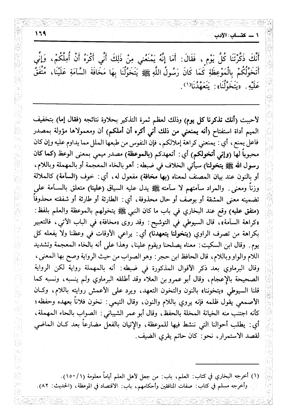 وقال ابن السكيت: معناه يصلحنا ويقوم علينا، وهذا على أنه بالخاء المعجمة وتشديد الواو وباللام. قال الحافظ ابن حجر: وهو الصواب من حيث الرواية وصح بها المعنى. وقال البرماوي بعد ذكر الأقوال المذكورة في ضبطه: إنه بالمهملة رواية لكن الرواية الصحيحة بالإعجام. وقال أبو عمرو بن العلاء: وقد أطلقه البرماوي ولم ينسبه ونسبه كما قلنا السيوطي «يتخوّننا» بالنون، والتخوّن: التعهد، ويرد على الأعمش روايته باللام، وكان الأصمعي يقول ظلمه فإنه يروي باللام والنون، وقال التيمي: تخون فلاناً بعهده وحفظه كأنه اجتنب منه الخيانة المخلة بالحفظ، وقال أبو عمر الشيباني: الصواب بالحاء المهملة: أي يطلب أحوالنا التي ننشط فيها للموعظة والإتيان بالفعل مضارعاً بعد كان الماضي لقصد الاستمرار نحو كان حاتم يقرى الضيف.