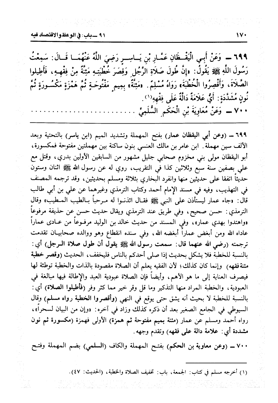 2700 - (وعن عمار) بفتح المهملة وتشديد الميم (بن ياسر) بالتحتية وبعد الألف سين مهملة بن عامر بن مالك العنسى بنون ساكنة بين مهملتين مفتوحة فمكسورة، أبو اليقظان مولى بني مخزوم صحابي جليل مشهور من السابقين الأولين بدري، وقتل مع عليّ بصفين سنة سبع وثلاثين كذا في التقريب، روى له عن رسول الله اثنان وستون حديثاً، اتفقا على حديثين منها، وانفرد البخاري بثلاثة، ومسلم بحديثين. وقد ترجمه المصنف في «التهذيب» ، وفيه مسند الإمام أحمد وكتاب الترمذي وغيرهما عن عليّ بن أبي طالب قال «جاء عمار ليستأذن على النبي فقال: ائذنوا له مرحبا بالطيب المطيب» وقال الترمذي: حسن صحيح. وفي طريق عند الترمذي ويقال: حديث حسن عن حذيفة مرفوعاً (واهتدوا بهدى عمار) وفي «المسند» من حديث خالد بن الوليد مرفوعاً «من عادى عماراً عاداه الله، ومن أبغض عماراً أبغضه الله» وفي سنده انقطاع، وهو والده صحابيان تقدمت ترجمته (رضي الله عنهما قال: سمعت رسول الله يقول: إن طول صلاة الرجل) أي بالنسبة للخطبة فلا يشكل بحديث «إذ صلى أحدكم بالناس فليخفف» الحديث (وقصر خطبته مئنة من فقهه) وإنما كان كذلك لأن الفقيه يعلم أن الصلاة مقصودة بالذات والخطبة توطئة لها، فيصرف العناية إلى ما هو الأهم، وأيضاً فإن الصلاة عبودية العبد والإطالة فيها مبالغة في العبودية، والخطبة المراد منها التذكير، وما قلّ وقرّ خير مما كثر وفرّ (فأطيلوا الصلاة) أي بالنسبة للخطبة، لا بحيث أنه يشق حتى يوقع في النهي (وأقصروا الخطبة رواه مسلم) وقال السيوطي في الجامع الصغير بعد أن ذكره كذلك وزاد في آخره «وإن من البيان لسحراً» رواه أحمد ومسلم عن عمار (مئنة بميم مفتوحة ثم همزة) الأولى فهمزة (مكسورة ثم نون مشددة: أي علامة دالة على فقهه) وتقدم وجهه.