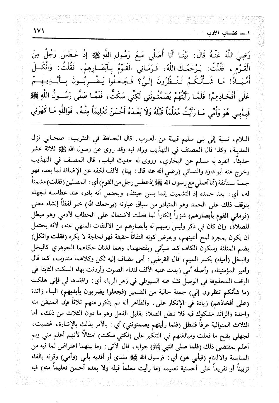 اللام نسبة إلى بني سليم قبيلة من العرب. قال الحافظ في «التقريب» : صحابي نزل المدينة، وكذا قال المصنف في التهذيب وزاد فيه: وقد روى عن رسول الله ثلاثة عشر حديثاً انفرد به مسلم عن البخاري. وروى له حديث الباب قال المصنف في «التهذيب» : وخرج عنه أبو داود والنسائي (رضي الله عنه قال: بيننا) الألف لكفه عن الإضافة لما بعده فهو جملة مستأنفة (أنا أصلي مع رسول الله إذ عطس رجل من القوم) أي المصلين (فقلت) مشمتاً له أي بعد حمده إذ التشميت إنما يسن حينئذ، ويحتمل أنه بادره عند عطاسه لجهله بتوقف ذلك على الحمد، وهو المتبادر من سياق عبارته (يرحمك الله) خبر لفظاً إنشاء معنى (فرماني القوم بأبصارهم) شزراً إنكاراً لما فعلت لاشتماله على الخطاب لآدمي، وهو مبطل للصلاة وإن كان في ذكل وليس رميهم له بأبصارهم من الالتفات المنهي عنه لأنه يحتمل أن يكون بمجرد لمح أعينهم وبفرض كونه التفاتاً حقيقة فهو لحاجة لا يكره (فقلت واثكل) بضم المثلثة وسكون الكاف كما سيأتي وبفتْحِهما وهما لغتان حكاهما الجوهري كالبخل والبخل (أميَّاه) بكسر الميم، قال القرطبي: أمي مضاف إليه ثكل وكلاهما مندوب، كما قال: واأمير المؤمنيناه، وأصله أمي زيدت عليه الألف لنداء الصوت وأردفت بهاء السكت الثابتة في الوقف المحذوفة في الوصل نقله عنه السيوطي في زهر الربا: أي وافقدها لي فإني هلكت (ما شأنكم تنظرون إلى) جملة حالية من الضمير (فجعلوا يضربون بأيديهم) الباء زائدة (على أفخاذهم) زيادة في الإنكار على. والظاهر أنه لم يتكرر منهم ثلاثاً، فإن المتيقن منه واحدة، والزائد مشكوك فيه فلا تبطل الصلاة بقليل الفعل، وهو ما دون الثلاث من ذلك. أما الثلاث المتوالية عرفاً فتبطل (فلما رأيتهم يصمتونني) أي بالأمر بذلك بالإشارة، غضبت، لجهلي بقبح ما فعلت ومبالغتهم في التنكير على (لكني سكت)