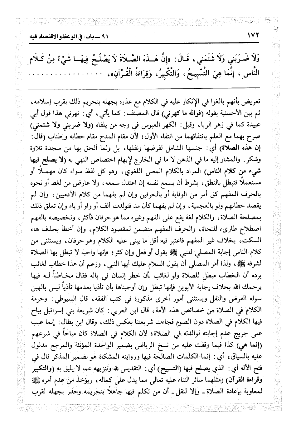 الإنكار عليه في الكلام مع عذره بجهله بتحريم ذلك بقرب إسلامه، ثم بين الأحسنية بقوله (فوالله ما كهرني) قال المصنف: كما يأتي: أي نهرني هذا قول أبي عبيدة كما في زهر الربا. وقيل الكهر: العبوس في وجه من يلقاه (ولا ضربني ولا شتمني) صرح بهما مع العلم بانتفائهما من انتفاء الأول لأن مقام المدح مقام خطابة وإطناب (قال: إن هذه الصلاة) أي جنسها الشامل لفرضها ونفلها، بل ولما ألحق بها من سجدة تلاوة وشكر والمشار إليه ما في الذهن لا ما في الخارج، لإبهام اختصاص النهي به (لا يصلح فيها شيء من كلام الناس) المراد بالكلام المعني اللغوي وهو: كل لفظ سواء كان مهملاً أو مستعملاً، فتبطل بالنطق بشرط أن يسمع نفسه إن اعتدل سمعه ولا عارض من لغط أو نحوه بالحرف المفهم كق أمر من الوقاية أو بالحرفين وإن لم يفهما من كلام الآدميين وإن لم يقصد خطابهم ولو بالعجمية وإن لم يفهما كأن مد فتولدت ألف أو واو أو ياء وإن تعلق ذلك بمصلحة الصلاة، والكلام لغة: يقع على المفهم وغيره مما هو حرفان فأكثر، وتخصيصه بالمفهم اصطلاح طارىء للنحاة، والحرف المفهم متضمن لمقصود الكلام وإن أخطأ بحذف هاء السكت بخلاف غير المفهم، فاعتبر فيه أقل ما يبني عليه الكلام وهو حرفان، ويستثنى من كلام الناس إجابة المصلي للنبي بقول أو فعل وإن كثر فإنها واجبة لا تبطل بها الصلاة لشرفه ولذا أمر المصلي أن يقول: السلام عليك أيها النبي، وزعم أن هذا الخطاب لغائب يرده أن الخطاب مبطل للصلاة ولو لغائب بأن خطر إنسان في باله فقال مخاطباً له