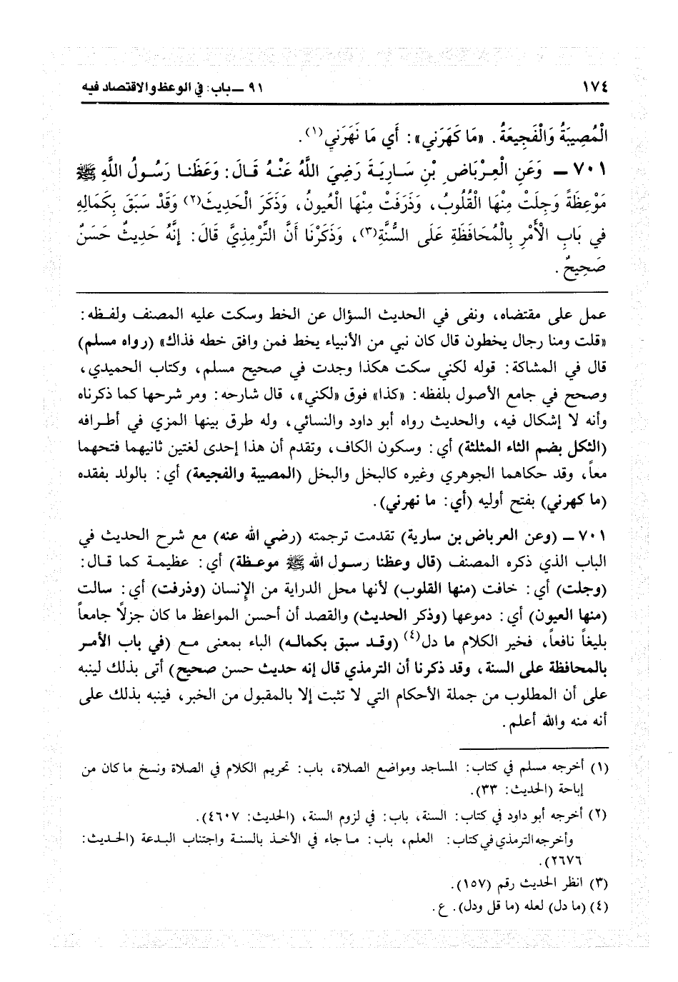 4702 - (وعن العرباض بن سارية) تقدمت ترجمته (رضي الله عنه) مع شرح الحديث في الباب الذي ذكره المصنف (قال: وعظنا رسول الله موعظة) أي عظيمة كما قال (وجلت) أي خافت (منها القلوب) لأنها محل الدراية من الإنسان (وذرفت) أي سالت (منها العيون) أي دموعها (وذكر الحديث) والقصد أن أحسن المواعظ ما كان جزلاً جامعاً بليغاً نافعاً، فخير الكلام ما دل (وقد سبق بكماله) الباء بمعنى مع (في باب الأمر المحافظة على السنة، و) قد (ذكرنا أن الترمذي قال: إنه حديث حسن صحيح) أتى بذلك لينبه على أن المطلوب من جملة الأحكام التي لا تثبت إلا بالمقبول من الخبر فينبه بذلك على أنه منه. والله أعلم.