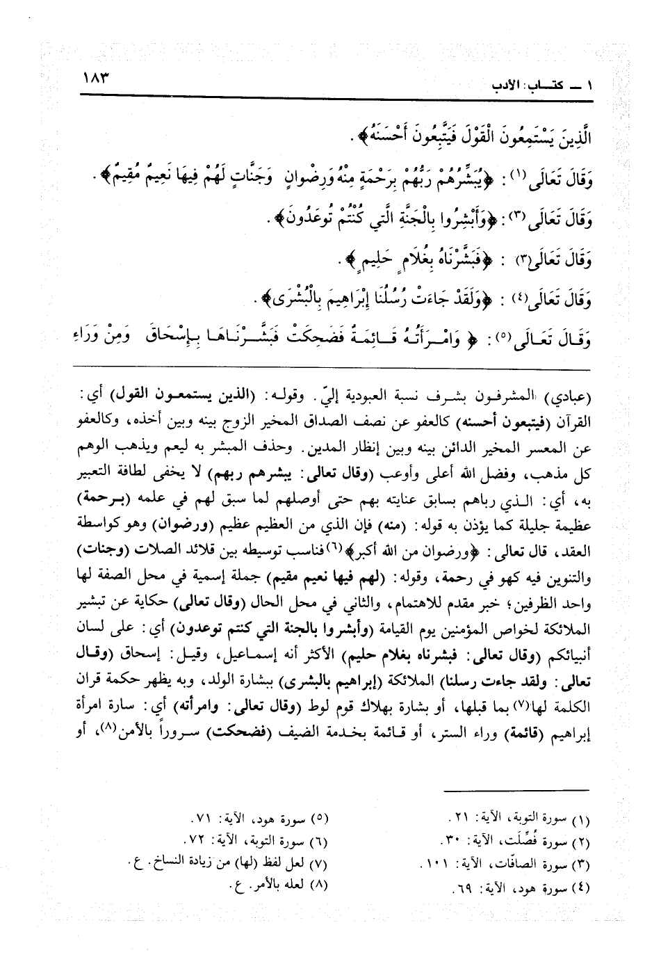 (وقال تعالى) : ( {ولقد جاءت رسلنا} ) الملائكة ( {إبراهيم بالبشرى} ) ببشارة الولد وبه يظهر حكمة قران الكلمة لها بما قبلها أو بشارة بهلاك قوم لوط.