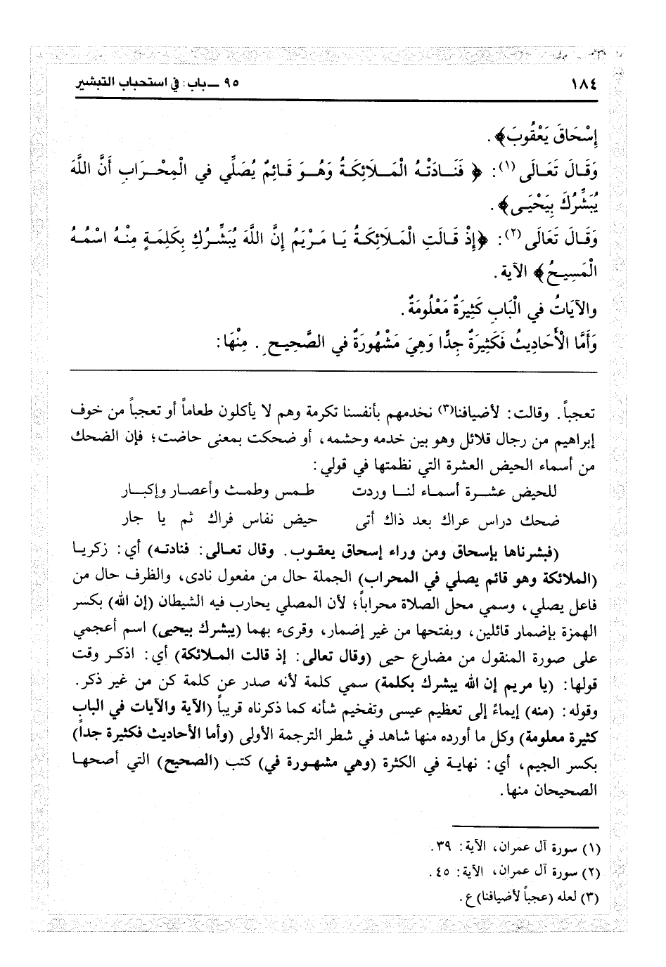 (وقال تعالى) : ( {فنادته} ) أي زكريا ( {الملائكة وهو قائم يصلي في المحراب} ) الجملة حال من مفعول نادى والظرف حال من فاعل يصلي، وسمى محل الصلاة محراباً لأن المصلي يحارب فيه الشيطان ( {إن الله} ) بكسر الهمزة بإضمار قائلين وبفتحها من غير إضمار وقرىء بهما ( {يبشرك بيحيى} ) اسم أعجمي على صورة المنقول من مضارع حيى.