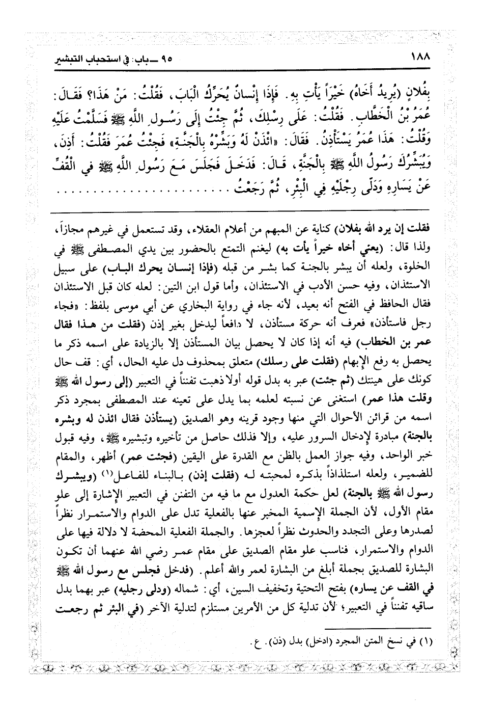 الخطاب) فيه أنه إذا كان لا يحصل بيان المستأذن إلا بالزيادة على اسمه ذكر ما يحصل به رفع الإبهام (فقلت: على رسلك) متعلق بمحذوف دل عليه الحال: أي وقف حال كونك على هينتك (ثم جئت) عبر به بدل قوله أوّلاً ذهبت تفنناً في التعبير (إلى رسول الله وقلت: هذا عمر) استغنى عن نسبته لعلمه بما يدل على تعيينه عند المصطفى بمجرد ذكر اسمه من قرائن الأحوال التي منها وجود قرينه وهو الصديق (يستأذن، فقال: ائذن له وبشره بالجنة) مبادرة لإدخال السرور عليه، وإلا فذلك حاصل من تأخيره وتبشيره، وفيه قبول خبر الواحد، وفيه جواز العمل بالظن مع القدرة على اليقين (فجئت عمر) أظهر والمقام للضمير ولعله استلذاذاً بذكره لمحبته له (فقلت: أذن) بالبناء للفاعل (ويبشرك رسول الله بالجنة) لعل حكمة العدول مع ما فيه من التفنن في التعبير الإشارة إلى علوّ مقام الأول، لأن الجملة الإسمية المخبر عنها بالفعلية تدل على الدوام والاستمرار نظراً لصدرها وعلى التجدد والحدوث نظراً لعحزها، والجملة الفعلية المحضة لا دلالة فيها على الدوام والاستمرار، فناسب علوّ مقام الصديق على مقام عمر رضي الله عنهما أن تكون البشارة للصديق بجملة أبلغ من البشارة لعمر، والله أعلم (فدخل فجلس مع رسول الله في القفّ عن يساره) بفتح التحتية وتخفيف السين أي شماله (ودلى رجليه) عبر بهما بدل ساقيه تفنناً في التعبير، لأنّ تدلية كل من الأمرين مستلزم لتدلية الآخر (في البئر) ، ثم رجعت