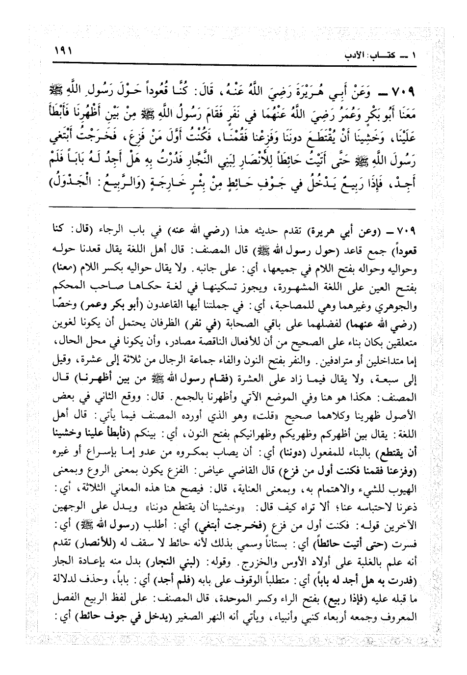 3710 - (وعن أبي هريرة) تقدم حديثه هذا (رضي الله عنه) في باب الرجاء (قال: كنا قعوداً) جمع قاعد (حول رسول الله) قال المصنف: قال أهل اللغة: يقال قعدنا حوله وحواليه وحواله بفتح اللام في جميعها: أي على جانبه ولا يقال حواليه بكسر اللام (معنا) بفتح العين على اللغة المشهورة، ويجوز تسكينها في لغة حكاها صاحب «المحكم» والجوهري وغيرهما، وهي للمصاحبة: أي في جملتنا أيها القاعدون (أبو بكر وعمر) وخصا (رضي الله عنهما) لفضلهما على باقي الصحابة (في نفر) الظرفان يحتمل أن يكونا لغويين متعلقين بكان بناء على الصحيح من أن للأفعال الناقصة مصادر، وأن يكونا في محل الحال إما متداخلين أو مترادفين، والنفر بفتح النون والفاء جماعة الرجال من ثلاثة إلى عشرة، وقيل إلى سبعة، ولا يقال فيما زاد على العشرة (فقام رسول الله من بين أظهرنا) قال المصنف: هكذا هو هنا، وفي الموضع الآتي، وأظهرنا بالجمع قال: ووقع الثاني في بعض الأصول ظهرينا وكلاهما صحيح، قلت: وهو الذي أورده المصنف فيما يأتي قال أهل اللغة: يقال بين أظهركم وظهريكم وظهرانيكم بفتح النون: أي بينكم (فأبطأ علينا وخشينا أن يقتطع) بالبناء للمفعول (دوننا) أي يصاب بمكروه