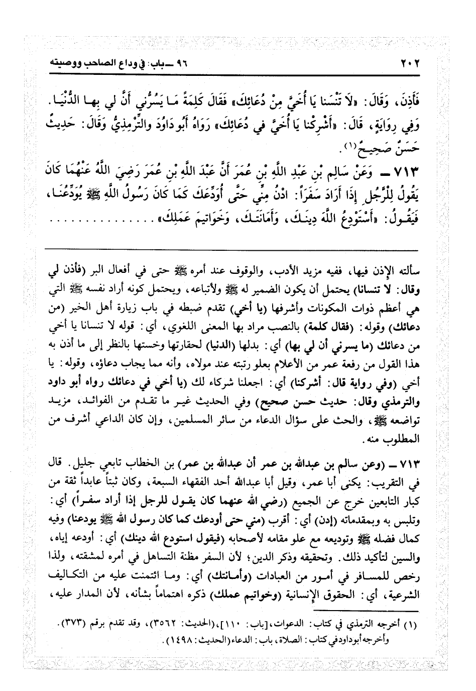 4715 - (وعن سالم بن عبد الله بن عمر أن عبد الله بن عمر) بن الخطاب تابعي جليل، قال في التقريب: يكنى أبا عمر، وقيل أبا عبد الله أحد الفقهاء السبعة، وكان ثبتا عابداً ثقة من كبار التابعين خرّج عن الجميع (رضي الله عنهما كان يقول لرجل إذا أراد سفراً) أي وتلبس به وبمقدماته (ادن) أي اقرب (مبنى حتى أودعك كما كان رسول الله يودعنا) وفيه كما فضله وتوديعه مع علو مقامه لأصحابه (فيقول: أستودع الله دينك) أي أودعه إياه. والسين لتأكيد ذلك وتحقيقه، وذكر الدين لأن السفر مظنة التساهل في أمره لمشقته، ولذا رخص للمسافر في أمور من العبادات (وأمانتك) أي وما ائتمنت عليه من التكاليف الشرعية، أو الحقوق الإنسانية (وخواتيم عملك) ذكره اهتماماً بشأنه لأن المدار عليه