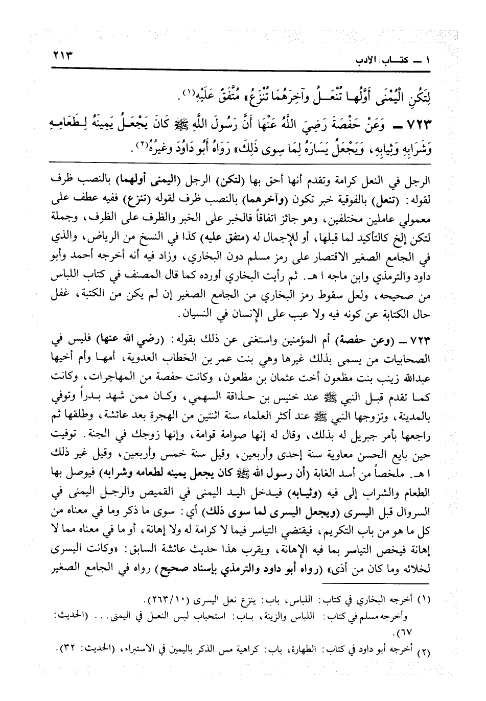 5725 - (وعن حفصة) أم المؤمنين واستغنى عن ذلك بقوله (رضي الله عنها) فليس في الصحابيات من يسمى بذلك غيرها وهي بنت عمر بن الخطاب العدوية، أمها وأم أخيها عبد الله زينب بنت مظعون أخت عثمان بن مظعون، وكانت حفصة من المهاجرات وكانت كما تقدم قبل النبي عند خنيس بن حذافة السهمي، وكان حفصة من المهاجرات وكانت كما تقدم قبل النبي عند خنيس بن حذافة السهمي، وكان ممن شهد بدراً وتوفي بالمدينة، وتزوّجها النبيّ عند أكثر العلماء سنة اثنتين من الهجرة بعد عائشة وطلقها ثم راجعها بأمر جبريل له بذلك وقال له إنها صوّامة قوّامة وإنها زوجك في الجنة توفيت حين بايع الحسن معاوية سنة إحدى وأربعين، وقيل خمس وأربعين، وقيل غير ذلك اهـ ملخصاً من «أسد الغابة» . (أن رسول الله كان يجعل يمينه لطعامه وشرابه) فيوصل بها الطعام والشراب إلى فيه (وثيابه) فيدخل اليد اليمنى في القميص والرجل اليمنى في السروال قبل اليسرى (ويجعل اليسرى لما سوى ذلك) أي سوى ما ذكر وما في معناه من كل ما هو من باب التكريم فيقتضي التياسر فيما لا كرامة له ولا إهانة، أو ما في معناه مما لا إهانة فيه فيخص التياسر بما فيه الإهانة، ويقرب هذا حديث عائشة السابق «وكانت اليسرى لخلائه وما كان من أذى» (رواه أبو داود وغيره) والترمذي بإسناد صحيح رواه في «الجامع الصغير»
