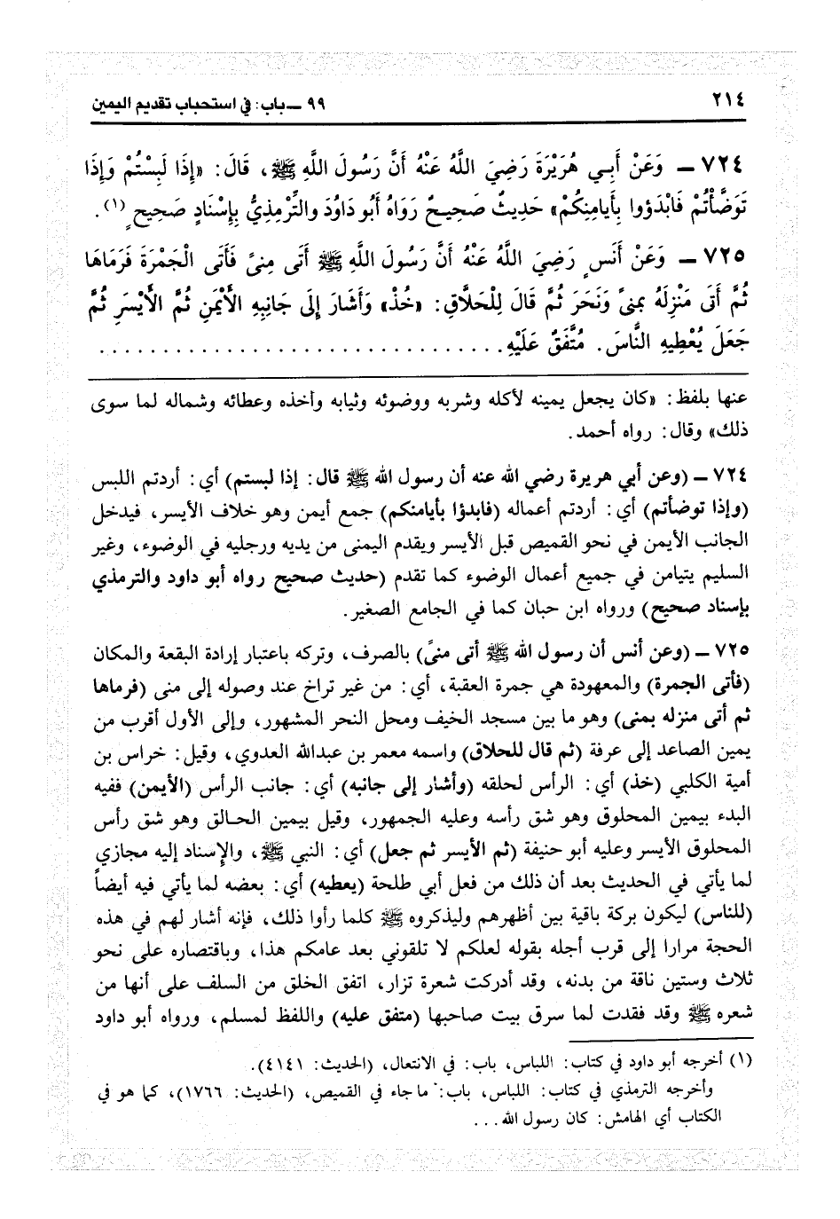 عنها بلفظ «كان يجعل يمينه لأكله وشربه ووضوئه وثيابه وأخذه وعطائه وشماله لما سوى ذلك» وقال رواه أحمد.