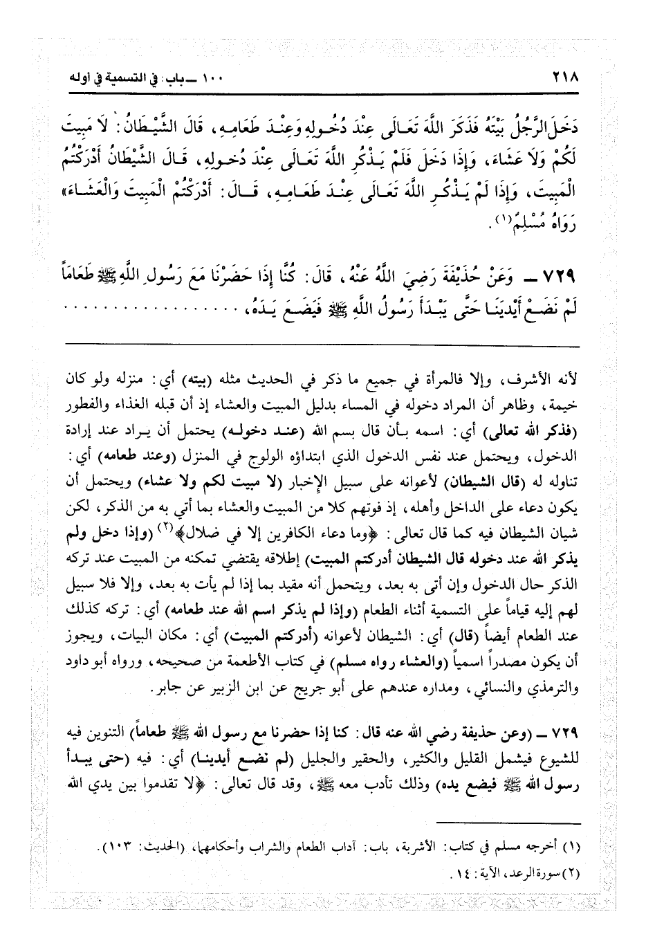 لأنه الأشرف، وإلا فالمرأة في جميع ما ذكر في الحديث مثله (بيته) أي منزله ولو كان خيمة، وظاهر أن المراد دخوله في المساء بدليل المبيت والعشاء، إذ إن قبله الغذاء والفطور (فذكر الله تعالى) أي اسمه بأن قال بسم الله (عند دخوله) يحتمل أن يراد عند إرادة الدخول، ويحتمل عند نفس الدخول الذي ابتداؤه الولوج في المنزل (وعند طعامه) أي تناوله له (قال الشيطان) لأعوانه على سبيل الإخبار (لا مبيت لكم ولا عشاء) ويحتمل أن يكون دعاء على الداخل وأهله إذ فوتهم كلا من المبيت والعشاء بما يأتي به من الذكر، لكن شأن الشيطان فيه كما قال تعالى: {وما دعاء الكافرين إلا في ضلال} (الرعد: 14) (وإذا دخل فلم يذكر الله تعالى عند دخوله قال الشيطان: أدركتم المبيت) إطلاقه يقتضي تمكنه من المبيت عند تركه الذكر حال الدخول وإن أتى به بعد، ويحتمل أنه مقيد بما إذا لم يأت به بعد، وإلا فلا سبيل لهم إلا قياساً على التسمية أثناء الطعام (وإذا لم يذكر اسم الله عند طعامه) أي تركه كذلك عند الطعام أيضاً (قال) أي الشيطان لأعوانه (أدركتم المبيت) أي مكان البيات، ويجوز أن يكون مصدراً اسمياً (والعشاء. رواه مسلم) في كتاب الأطعمة من «صحيحه» ، ورواه أبو داود والترمذي والنسائي، ومداره عندهم على أبي جريج عن ابن الزبير عن جابر.