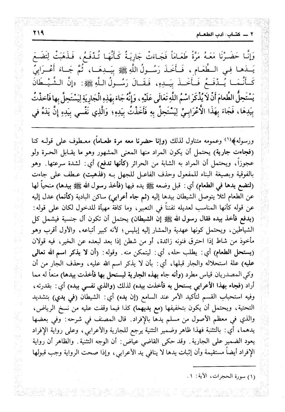 ورسوله} (الحجرات: 1) وعمومه متناول لذلك (وإنا حضرنا معه مرّة طعاماً) معطوف على قوله كنا (فجاءت جارية) يحتمل أن يكون المراد منها المعنى المشهور وهو ما يقابل الحرة ولو عجوزاً، ويحتمل أن المراد به الشابة من الحرائر (كأنها تدفع) أي لشدة سرعتها وهو بالفوقية وبصيغة البناء للمفعول وحذف الفاعل للجهل به (فذهبت) عطف على جاءت (لتضع يدها في الطعام) أي قبل وضعه يده فيها (فأخذ رسول الله بيدها) منحياً لها عن الطعام لئلا يتوصل الشيطان بيدها (إليه ثم جاء أعرابيّ) ساكن البادية (كأنما) عدل إليه عن قوله كأنها المناسب لعديله تفنناً في التعبير وما كافة مهيئة للدخول لكان على قوله (يدفع فأخذه بيده، فقال رسول الله إن الشيطان) يحتمل أن تكون أل جنسية فيشمل كل الشياطين، ويحتمل كونها عهدية، والمشار إليه إبليس لأنه كبير أتباعه، والأول أقرب، وهل هو مأخوذ من شاط إذا احترق فنونه زائدة أو من شطن إذا بعد لبعده عن الخير فيه قولان (يستحل الطعام) أي يطلب حله: أي ليتمكن منه وقوله (أن لا يذكر اسم الله تعالى عليه) علة استحلاله والجار قبلها أي بأن لا يذكر اسم الله عليه، وحذف الجار من أن وكى المصدريان قياس مطرد (وأنه جاء بهذه الجارية ليستحل بها فأخذت بيدها) منعاً له مما أراد (فجاء بهذا الأعرابيّ يستحل به فأخذت بيده) لذلك (والذي نفسي بيده) أي بقدرته. وفيه استحباب القسم لتأكيد الأمر عند السامع (إن يده) أي الشيطان (في يديّ) بتشديد التحتية، ويحتمل أن يكون بتخفيفها (مع يديهما) كذا فيما وقفت عليه من نسخ الرياض. والذي في معظم الأصول من مسلم يدها بالإفراد، قال
