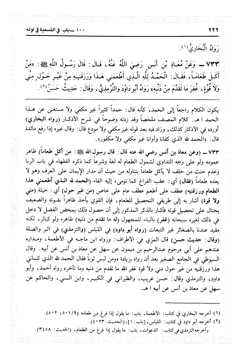 8735 - (وعن معاذ بن أنس رضي الله عنه قال: قال رسول الله: من أكل طعاماً) ظاهر عمومه ولو على وجه التداوي لشمول الطعام له لغة وشرعاً كما ذكره الفقهاء في باب الربا وعدم حنث من حلف لا يأكل طعاماً يتناوله من حيث أن مدار الأيمان على العرف وهو لا يعدّه طعاماً (فقال) أي عقب الفراغ كما تومىء إليه الفاء (الحمد لله الذي أطعمني هذا الطعام ورزقنيه) عطف على أطعم عطف عام على خاص (من غير حول) أي حيلة (منى ولا قوّة) أشار به إلى طريق التحصيل للطعام، فإن القويّ يأخذ ظاهراً بقوته والضعيف يحتال على تحصيل قوته، فأشار بالذكر المذكور إلى أن حصول ذلك بمحض الفضل لا دخل في ذلك لغيره سبحانه (غفر) بالبناء للمجهول (له ما تقدم من ذنبه) ظاهره ولو كبائر لكنه مقيد عندنا بالصغائر غير التبعات (رواه أبو داود) في اللباس (والترمذي) في البر والصلة (وقال: حديث حسن) قال المزي في «الأطرف» : ورواه ابن ماجه في الأطعمة، ومداره عندهم على أبي مرحوم عبد الرحيم بن ميمون عن سهل عن معاذ بن أنس عن أبيه، وقال السيوطي في «الجامع الصغير» بعد أن رواه بزيادة «ومن لبس ثوباً فقال الحمد لله الذي كساني هذا ورزقنيه من غير حول منى ولا قوّة، غفر الله ما تقدم من ذنبه وما تأخر» ورواه أحمد وأبو داود والترمذي وقال: حسن غريب، والطبراني في «الكبير» وابن السني والحاكم عن سهل عن معاذ بن أنس عن أبيه اهـ.