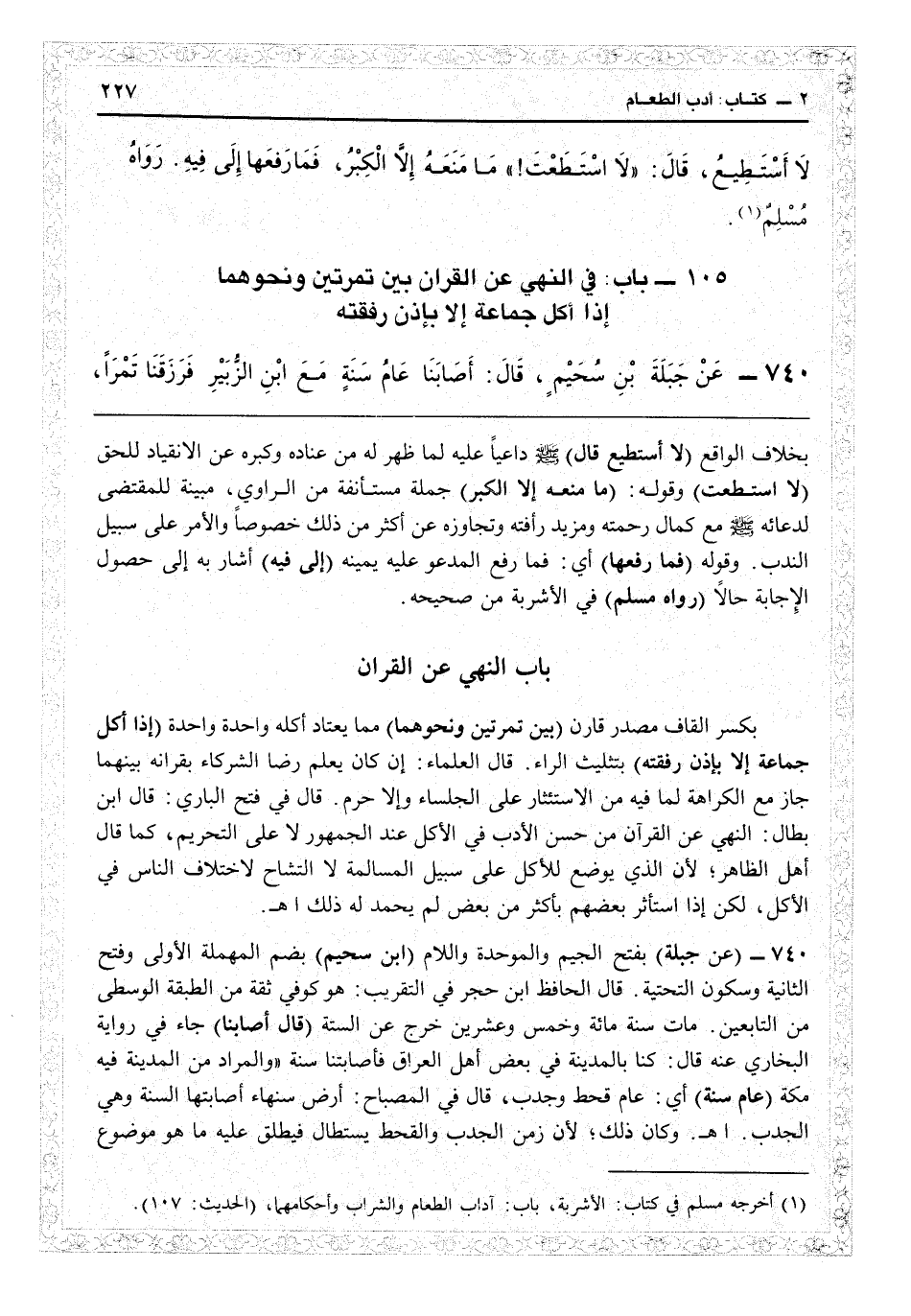 بكسر القاف مصدر قارن (بين تمرتين ونحوهما) مما يعتاد أكله واحدة واحدة (إذا أكل جماعة إلا بإذن رفقته) بتثليث الراء. قال العلماء: إن كان يعلم رضا الشركاء بقرانه بينهما جاز مع الكراهة لما فيه من الاستئثار على الجلساء وإلا حرم. قال في «فتح الباري» : قال ابن بطال: النهي عن القران من حسن الأدب في الأكل عند الجمهور لا على التحريم كما قال أهل الظاهر، لأن الذي يوضع للأكل على سبيل المسالمة لا التشاحّ لاختلاف الناس في الأكل، لكن إذا استأثر بعضهم بأكثر من بعض لم يحمد له ذلك اهـ.