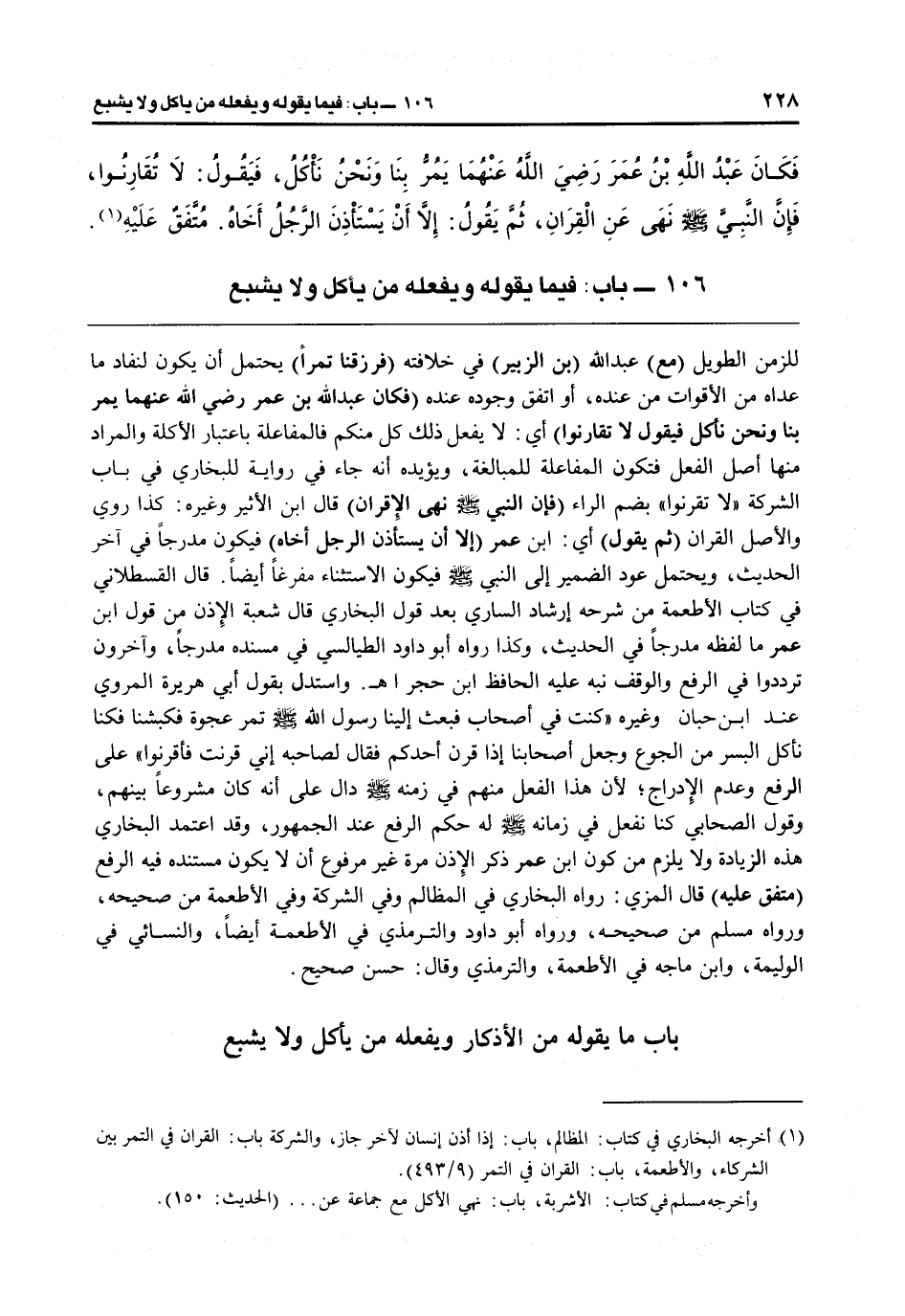 عند الجمهور، وقد اعتمد البخاري هذه الزيادة، ولا يلزم من كون ابن عمر ذكر الإذن مرة غير مرفوع أن لا يكون مستنده فيه الرفع (متفق عليه) قال المزي: رواه البخاري في المظالم وفي الشركة وفي الأطعمة من «صحيحه» ، ورواه مسلم في الأطعمة من «صحيحه» ورواه أبو داود والترمذي في الأطعمة أيضاً والنسائي ي الوليمة وابن ماجه في الأطعمة والترمذي وقال حسن صحيح.