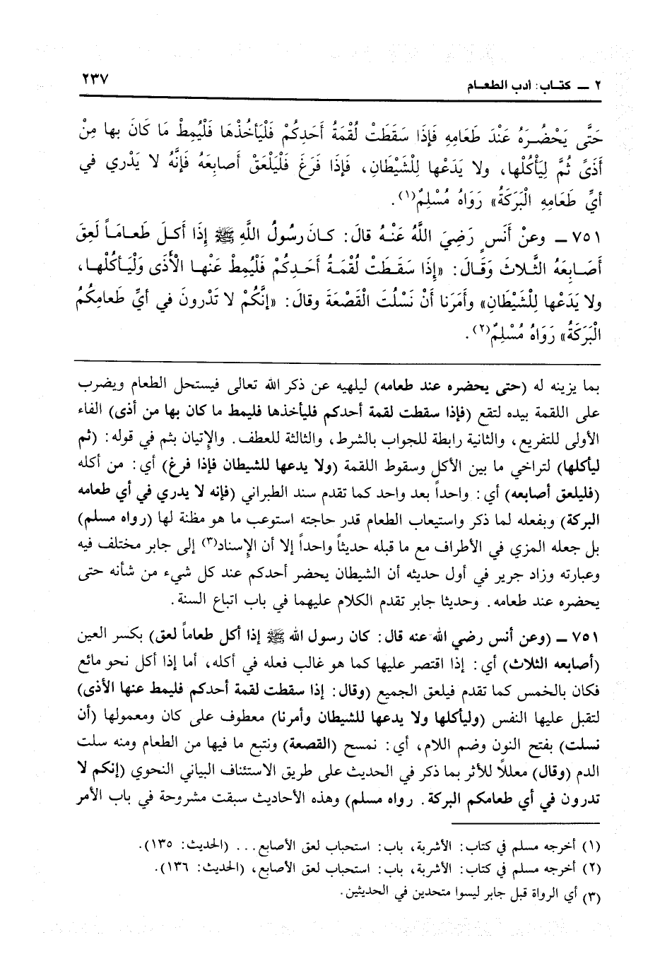 بما يزينه له (حتى يحضره عند طعامه) ليلهيه عن ذكر الله تعالى فيستحل الطعام ويضرب على اللقمة بيده لتقع (فإذا سقطت لقمة أحدكم فليأخذها فليمط ما كان بها من أذى) الفاء الأول للتفريع والثانية رابطة للجواب بالشرط والثالثة للعطف، والإتيان بثم في قوله (ثم ليأكلها) لتراخي ما بين الأكل وسقوط اللقمة (ولا يدعها للشيطان، فإذا فرغ) أي من أكله (فليلعق أصابعه) أي واحداً بعد واحد كما تقدم سند الطبراني (فإنه لا يدري في أي طعامه البركة) وبفعله لما ذكر واستيعاب الطعام قدر حاجته استوعب ما هو مظنة لها (رواه مسلم) بل جعله المزي في «الأطراف» مع ما قبله حديثاً واحداً إلا أن الإسناد إلى جابر مختلف فيه وعبارته. وزاد جرير في أول حديثه «إن الشيطان يحضر أحدكم عند كل شيء من شأنه حتى يحضره عند طعامه» وحديثا جابر تقدم الكلام عليهما في باب اتباع السنة.
