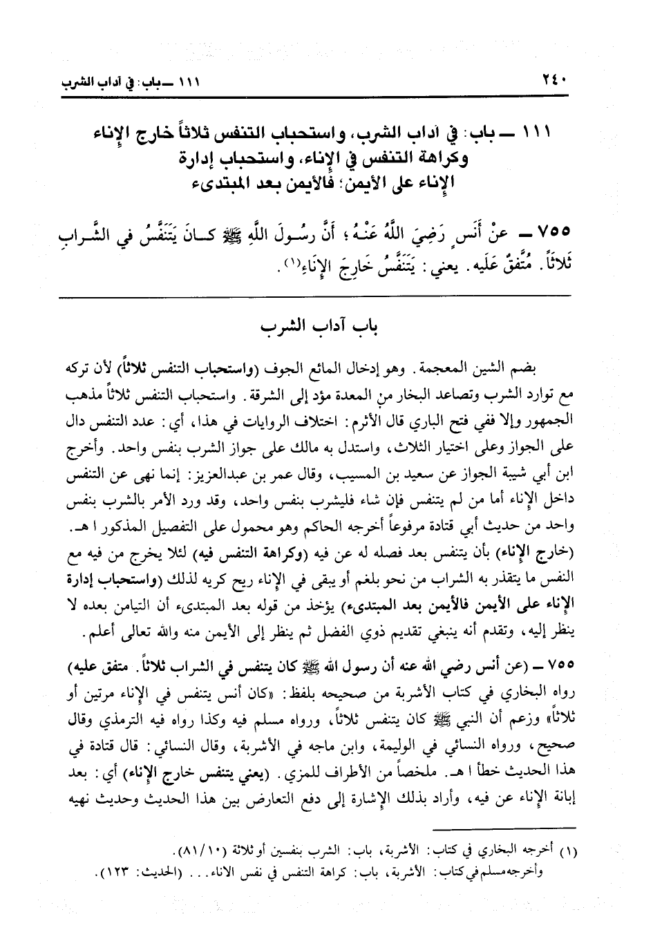 1757 - (عن أنس رضي الله عنه: أن رسول الله كان يتنفس في الشراب ثلاثاً، متفق عليه) رواه البخاري في كتاب الأشربة من «صحيحه» بلفظ «كان أنس يتنفس من الإناء مرتين أو ثلاثاً، وزعم أن النبيّ كان يتنفس ثلاثاً» ورواه مسلم فيه، وكذا رواه فيه الترمذي وقال صحيح، ورواه النسائي في الوليمة وابن ماجه في الأشربة، وقال النسائي: قال قتادة: في هذا الحديث خطأ اهـ ملخصاً من «الأطراف» للمزي (يعني يتنفس خارج الإناء) أي بعد إبانة الإناء عن فيه، وأراد بذلك الإشارة إلى دفع التعارض بين هذا الحديث وحديث نهيه