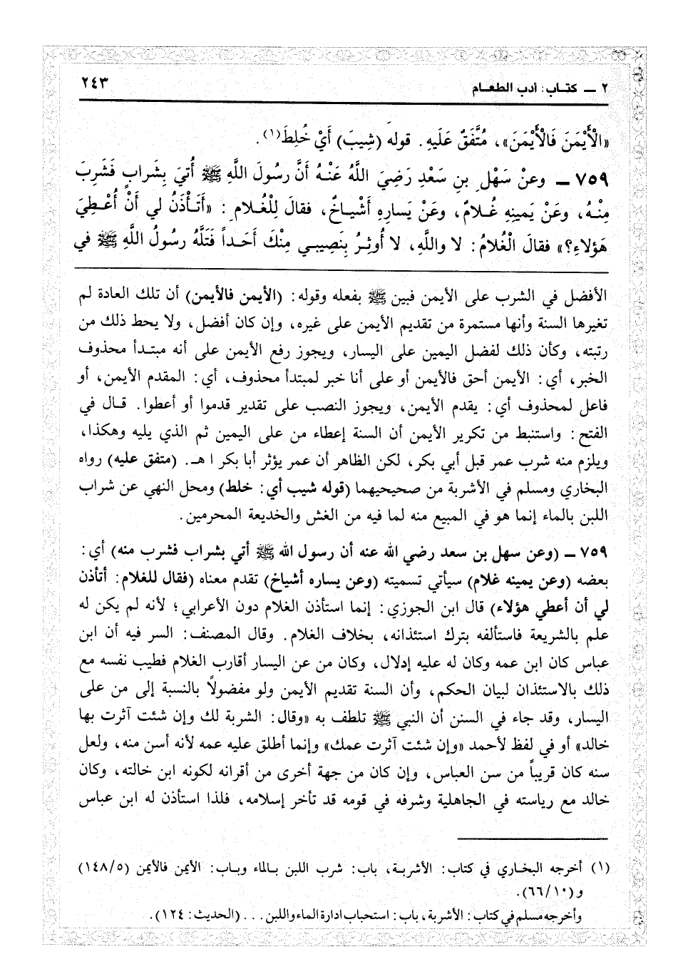 الأفضل في الشرب على الأيمن، فبين النبيّ بفعله وقوله (الأيمن فالأيمن) أن تلك العادة لم تغيرهاالسنة وأنها مستمرة من تقديم الأيمن على غيره وإن كان أفضل، ولا يحطّ ذلك من رتبته، وكأن ذلك لفضل اليمين على اليسار، ويجوز رفع الأيمن على أنه مبتدأ محذوف الخبر: أي الأيمن أحق فالأيمن، أو على أنه خبر لمبتدإ محذوف: أي المقدم الأيمن، أو فاعل لمحذوف: أي يقدم الأيمن، ويجوز النصب على تقدير قدموا أو أعطوا.g قال في «الفتح» : واستنبط من تكرير الأيمن أن السنة إعطاء من على اليمين ثم الذي يليه وهكذا، ويلزم منه شرب عمر قبل أبي بكر لكن الظاهر أن عمر يؤثر أبا بكر اهـ (متفق عليه) رواه البخاري ومسلم في الأشربة من «صحيحيهما» (قوله شيب: أي خلط) ومحل النهي عن شراب اللبن بالماء إنما هو في المبيع منه لما فيه من الغش والخديعة المحرمين.