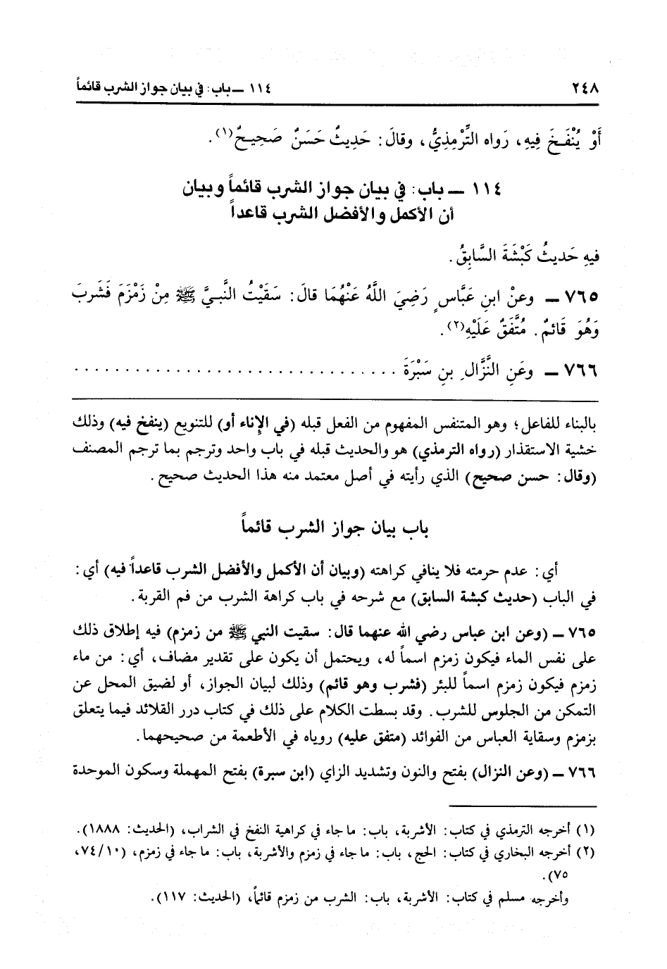 أي عدم حرمته، فلا ينافي كراهته (وبيان أن الأكمل والأفضل الشرب قاعداً. فيه) أي في الباب (حديث كبشة السابق) مع شرحه في باب كراهة الشرب من فم القربة.