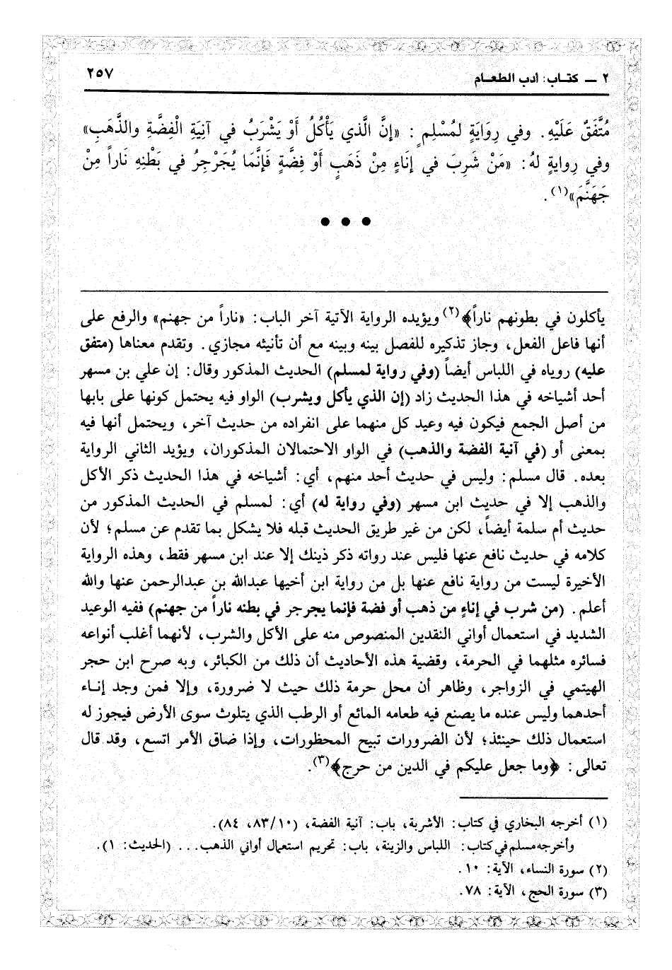 يأكلون في بطونهم ناراً} (النساء: 10) ويؤيده الرواية الآتية آخر البار ناراً من جهنم والرفع على أنها فاعل الفعل، وجاز تذكيره للفصل بينه وبينه مع أن تأنيثه مجازي وتقدم معناها (متفق عليه) روياه في اللباس أيضاً (وفي رواية لمسلم) الحديث المذكور وقال إن على ابن مسهر أحد أشياخه في هذا الحديث زاد (إن الذي يأكل ويشرب) الواو فيه يحتمل كونها على بابها من أصل الجمع فيكون فيه وعيد كل منهما على انفراده من حديث آخر، ويحتمل أنها فيه بمعنى أو (في آنية الفضة والذهب) في الواو الاحتمالان المذكوران ويؤيد الثاني الرواية بعده قال مسلم وليس في حديث أحد منهم: أي أشياخه في هذا الحديث ذكر الأكل والذهب إلا في حديث ابن مسهر (وفي رواية له) أي لمسلم في الحديث المذكور من حديث أم سلمة أيضاً، لكن من غير طريق الحديث قبله فلا يشكل بما تقدم عن مسلم لأن كلامه في حديث نافع عنها فليس عند رواته ذكر ذينك إلا عند ابن مسهر فقط، وهذه الرواية الأخيرة ليست من رواية نافع عنها بل من رواية ابن أخيها عبد الله ابن عبد الرحمن عنها والله أعلم (من شرب في إناء من ذهب أو فضة فإنما يجرجر في بطنه ناراً من جهنم) ففيه الوعيد الشديد في استعمال أواني النقدين المنصوص منه على الأكل والشرب لأنهما أغلب أنواعه فسائره مثلهما في الحرمة، وقضية هذه الأحاديث أن ذلك من الكبائر وبه صرح ابن حجر الهيتمي في «الزواجر» ، وظاهر أن محل حرمة ذلك حيث لا ضرورة، وإلا فمن وجد إناء أحدهما وليس عنده ما يصنع فيه طعامه المائع أو الرطب الذي يتلوّث سوى