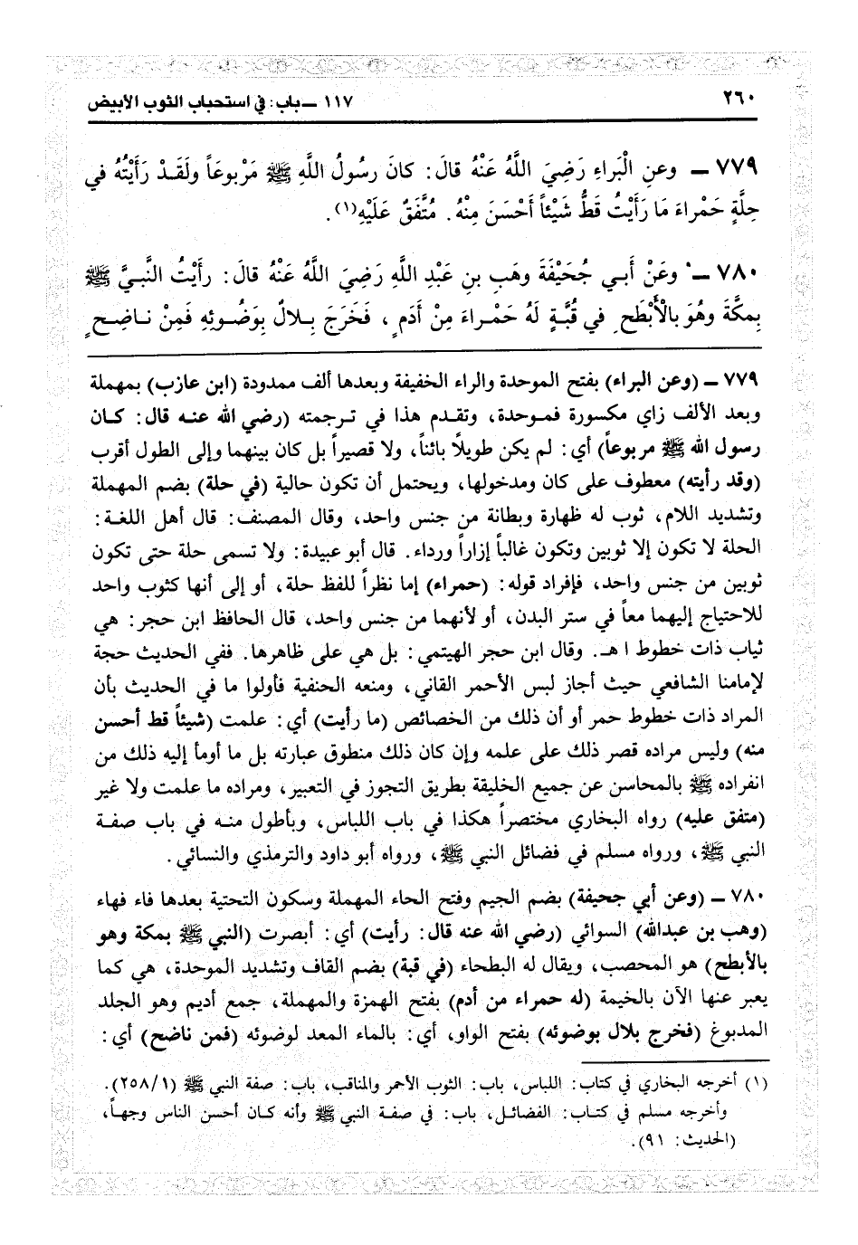 3781 - (وعن البراء) بفتح الموحدة والراء الخفيفة وبعدها ألف ممدودة (ابن عازب) بمهملة وبعد الألف زاي مكسورة فموحدة، وتقدم هذا في ترجمته (رضي الله عنه قال: كان رسول الله مربوعاً) أي لم يكن طويلاً بائناً ولا قصيراً بل كان بينهما وإلى الطول أقرب (وقد رأيته) معطوف على كان ومدخولها ويحتمل أن تكون حالية (في حلة) بضم المهملة وتشديد اللام: ثوب له ظهارة وبطانة من جنس واحد، وقال المصنف: قال أهل اللغة: الحلة لا تكون إلا ثوبين وتكون غالباً إزاراً ورداءءً قال أبو عبيدة: ولا تسمى حلة حتى تكون ثوبين من جنس واحد، فإفراد قوله (حمراء) إما نظراً للفظ حلة أو إلى أنها كثوب واحد للاحتياج إليهما معاً في ستر البدن أو لأنهما من جنس واحد، قال الحافظ ابن حجر: هي ثياب ذات خطوط اهـ. وقال ابن حجر الهيثمي: بل هي على ظاهرها. ففي الحديث حجة لإمامنا الشافعي حيث أجاز لبس الأحمر الفاني، ومنعه الحنفية فأولوا ما في الحديث بأن المراد ذات خطوط حمر، أو أن ذلك من الخصائص (ما رأيت) أي علمت (شيئاً قط أحسن منه) وليس مراده قصر ذلك على علمه وإن كان ذلك منطوق عبارته، بل ما أومأ إليه ذلك من انفراده بالمحاسن عن جميع الخليقة بطريق التجوّز في التعبير ومراده ما علمت ولا غيري (متفق عليه) رواه البخاري مختصراً هكذا في باب اللباس وبأطول منه في باب صفة النبي، ورواه مسلم في فضائل النبيّ، ورواه أبو داود والترمذي والنسائي.