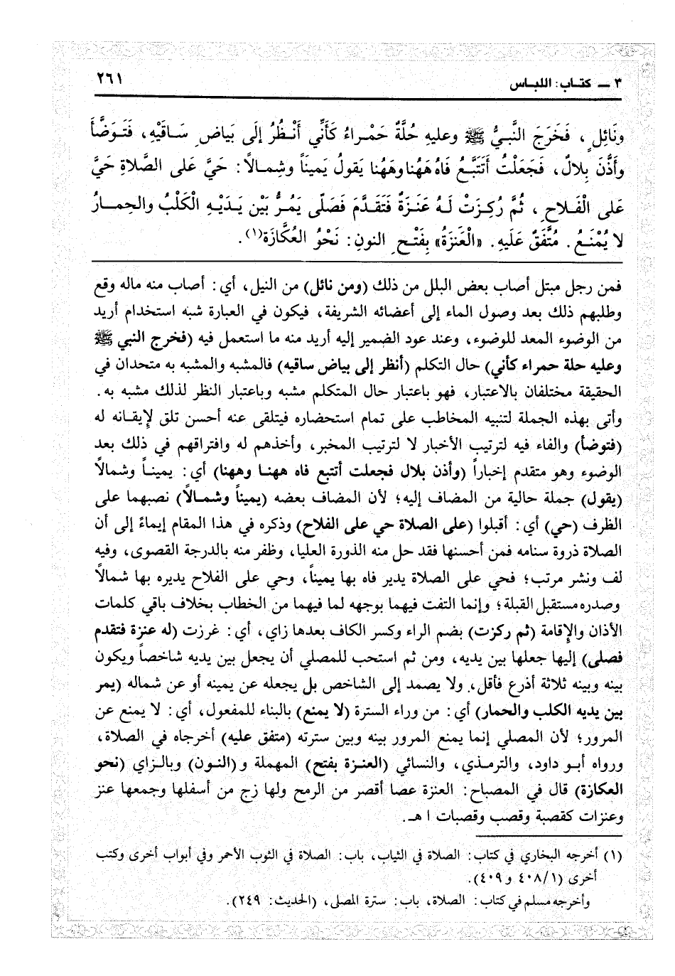 فمن رجل مبتل أصاب بعض البلل من ذلك (ومن نائل) من النيل: أي أصاب منه ماله وقع وطلبهم ذلك بعد وصول الماء إلى أعضائه الشريفة، فيكون في العبارة شبه استخدام أريد من الوضوء المعدّ للوضوء، وعند عود الضمير إليه أريد منه ما استعمل فيه (فخرج النبيّ حلة حمراء كأني) حال التكلم (انظر إلى بياض ساقيه) فالمشبه والمشبه به متحدان في الحقيقة مختلفان بالاعتبار، فهو باعتبار حال المتكلم مشبه وباعتبار النظر لذلك مشبه به، وأتى بهذه الجملة لتنبيه المخاطب على تمام استحضاره فيتلقى عنه أحسن تلق لإيقانه له (فتوضأ) والفاء فيه لترتيب الأخبار لا لترتيب المخبر وأخذهم له وافتراقهم في ذلك بعد الوضوء وهو متقدم إخباراً (وأذن بلال فجعلت أتتبع فاه ههنا وههنا) أي يميناً وشمالاً (يقول) جملة حالية من المضاف إليه لأن المضاف بعضه (يميناً وشمالاً) نصبهما على الظرف (حيّ) أي أقبلوا (على الصلاة حي على الفلاح) وذكره في هذا المقام إيماء إلى أن الصلاة ذروة سنامه، فمن أحسنها فقد حلّ منه الذروة العليا وظفر منه بالدرجة القصوى، وفيه لف ونشر مرتب، فحيّ على الصلاة يدير فاه بها يميناً، وحيّ على الفلاح يديره بها شمالاً وصدره مستقبل القبلة، وإنما التفت فيهما بوجهه لما فيهما من الخطاب بخلاف باقي كلمات الأذان والإقامة (ثم ركزت) بضم الراء وكسر الكاف بعدها زاي: أي غرزت (له عنزة فتقدم فصلى) إليها جعلها بين يديه ومن ثم استحب للمصلي أن يجعل بين يديه