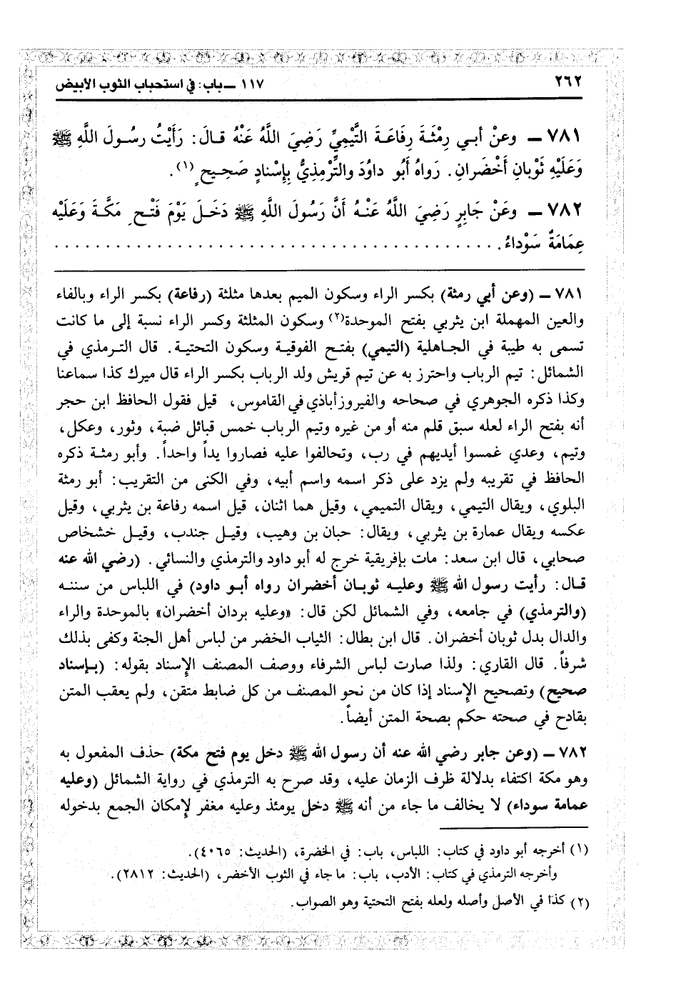 5783 - (وعن أبي رمثة) بكسر الراء وسكون الميم بعدها مثلثة (رفاعة) بكسر الراء وبالفاء والعين المهملة ابن يثربي بفتح الموحدة وسكون المثلثة وكسر الراء نسبة إلى ما كانت تسمى به طيبة في الجاهلية (التيمي) بفتح الفوقية وسكون التحتية. قال الترمذي: في «الشمائل» تيم الرباب، واحترز به عن تيم قريش ولد الرباب بكسر الراء، قال ميرك: كذا سماعنا وكذا ذكره الجوهري في «صحاحه» والفيروزأبادى في «القاموس» ، قيل فقول الحافظ ابن حجر: إنه بفتح الراء لعله سبق قلم منه أو من غيره. وتيم الرباب خمس قبائل: ضبة وثور وعكل وتيم وعدى غمسوا أيديهم في ربّ وتحالفوا عليه فصاروا يداً واحداً، وأبو رمثة ذكره الحافظ في «تقريبه» ولم يزد على ذكر اسمه واسم أبيه، وفي السكنى من «التقريب» أبو رمثة البلوي ويقال التيمي ويقال التميمي، وقيل هما اثنان، قيل اسمه رفاعة بن يثربي، وقيل عكسه، ويقال عمارة بن يثربي، ويقال حبان بن وهيب، وقيل جندب، وقيل خشخاش صحابي. قال ابن سعد: مات بأفريقية، خرج له أبو داود والترمذي والنسائي (رضي الله عنه قال: رأيت رسول الله ثوبان أخضران، رواه أبو داود) في اللباس من «سننه» (والترمذي) في «جامعه» ، وفي «الشمائل» «لكن قال: وعليه بردان أخضران» بالموحدة والراء والدال بدل ثوبان أخضران، قال ابن بطال: الثياب الخضر من لباس أهل الجنة وكفى بذلك شرفاً، قال القاري: ولذا صارت لباس الشرفاء، ووصف المصنف الإسناد بقوله (بإسناد صحيح) وتصحيح الإسناد إذا كان من نحو المصنف من كل ضابط متقن ولم يعقب المتن بقادح في صحته حكم بصحة المتن أيضاً.