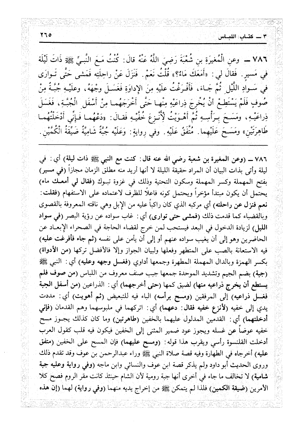 10788 - (وعن المغيرة بن شعبة رضي الله عنه قال: كنت مع النبيّ ذات ليلة) أي في ليلة وأتى بذات، لبيان أن المراد حقيقة الليلة لا أنها أريد منها مطلق الزمان مجازاً (في مسير) بفتح المهملة وكسر المهملة وسكون التحتية وذلك في غزوة تبوك (فقال لي أمعك ماء) يحتمل أن يكون مبتدأ مؤخراً ويحتمل كونه فاعلاً للظرف لاعتماده على الاستفهام (فقلت: نعم، فنزل عن راحلته) ، أي مركبه الذي كان راكباً عليه من الإبل وهي ناقته المعروفة بالقصوى وبالعضباء كما قدمت ذلك (فمشى حتى توارى) أي غاب سواده عن رؤية البصر (في سواد الليل) لزيادة الدخول في البعد، فيستحب لمن خرج لقضاء الحاجة في الصحراء الإبعاد عن الحاضرين، وهو إلى أن يغيب سواده عنهم أو إلى أن يأمن على نفسه (ثم جاء فأفرغت عليه) فيه الاستعانة بالصبّ على المتطهر وفعلها لبيان الجواز وإلا فالأفضل تركها (من الإداوة) بكسر الهمزة وبالدال المهملة المطهرة وجمعها أداوى (فغسل وجهه وعليه) أي النبي (جبة) بضم الجيم وتشديد الموحدة جمعها جبب: صنف معروف من اللباس (من صوف فلم يستطع أن يخرج ذراعيه منها) لضيق كمها (حتى أخرجهما) أي الذراعين (من أسفل الجبة فغسل ذراعيه) إلى المرفقين (ومسح برأسه) الباء فيه للتبعيض (ثم أهويت) أي مددت يدي إلى خفيه (لأنزع خفيه فقال: دعهما) أي اتركهما في ملبوسهما وهما القدمان (فإني أدخلتهما) أي القدمين المدلول عليهما بالخفين (طاهرتين) وما كان كذلك يجوز مسح خفيه عوضاً عن غسله، ويجوز عوض ضمير المثنى إلى الخفين فيكون فيه قلب كقول العرب: أدخلت القلنسوة رأسي، ويقرب هذا قوله (ومسح عليهما) فإن المسح على الخفين (متفق عليه) أخرجاه في الطهارة، وفيه قصة صلاة النبي وراء عبد الرحمن بن عوف وقد تقدم ذلك، وروى الحديث أبو داود ولم يذكر قصة ابن عوف والنسائي وابن ماجه.