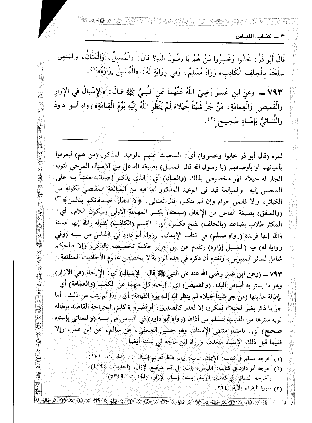 لمرة (قال أبو ذرّ خابوا وخسروا) أي المحدث عنهم بالوعيد المذكور (من هم) ليعرفوا بأعيانهم أو بأوصافهم (يا رسول الله» قال: المسبل) بصيغة الفاعل من الإسبال المرخي لثوبه الجار له خيلاء فهو مخصوص بذلك (والمنان) أي الذي يذكر إحسانه ممتناً به على المحسن إليه، والمبالغة قيد في الوعيد المذكور لما فيه من المبالدة المقتضى لكونه من الكبائر وإلا فالمن حرام وإن لم يتكرر، قال تعالى: {لا تبطلوا صدقاتكم بالمن والأذى} (البقرة: 264) (والمنفق) بصيغة الفاعل من الإنفاق (سلعته) بكسر المهملة الأولى وسكون اللام أي المكثر طلاب بضاعته (بالحلف) بفتح فكسر: أي القسم (الكاذب) كقوله والله إنها حسنة والله إنها فريدة (رواه مسلم) في كتاب الأيمان ورواه أبو داود في اللباس من «سننه» (وفي رواية له) فيه (المسبل إزاره) وتقدم عن ابن جرير حكمة تخصيصه بالذكر وإلا فالحكم شامل لسائر الملبوس، وتقدم أن ذكره في هذه الرواية لا يخصص عموم الأحاديث المطلقة.