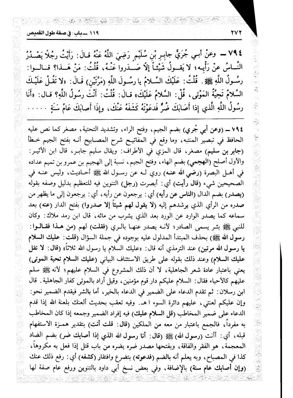 7796 - (وعن أبي جرى) بضم الجيم وفتح الراء وتشديد التحتية مصغر كما نص عليه الحافظ في «تبصير المنتبه» وما وقع في «المفاتيح شرح المصابيح» أنه بفتح الجيم خطأ (جابر بن سليم) مصغر قال المزي في «الأطراف» : ويقال سليم بن جابر، قال ابن الأثير: والأول أصح (الهجمي) بضم الهاء وفتح الجيم نسبة إلى الهجيم بن عمرو بن تميم، عداده في أهل البصرة (رضي الله عنه) روي له عن رسول الله أحاديث وليس عنه في الصحيحين شيء (قال: رأيت) أي أبصرت (رجلاً) التنوين فيه للتعظيم بدليل وصفه بقوله (يصدر) بضم الدال (الناس عن رأيه) أي يرجعون عن رأيه: أي يرجعون إلى ما يظهر من صدره من الرأي الذي يرشدهم إليه (لا يقول لهم شيئاً إلا صدروا) بفتح الدال (عنه) بعد سماعه كما يصدر الوارد عن الورد بعد الذي يشرب من مائه، قال ابن رمد ملاك: وكان للنبيّ بئر يسمى الصادر وإنه يصدر عنها بالري (فقلت) لهم (من هذا؟ فقالوا رسول الله) بحذف المبتدأ المدلول عليه بوجوده في جملة السؤال (قلت: عليك السلام يا رسول الله مرتين) عند الترمذي أنه قال «عليك السلام يا رسول الله ثلاثاً» (قال: لا تقل عليك السلام) وعلل ذلك بقوله على طريق الاستئناف البياني (عليك السلام تحية الموتى) يعني باعتبار عادة شعر الجاهلية لا أن ذلك المشروع في السلام عليهم لأنه سلم عليهم كالأحياء فقال «السلام عليكم دار قوم مؤمنين» وقيل أراد بالموتى كفار الجاهلية، قال ابن رسلان: ثم تقدم الدعاء على الضمير في الدعاء بالخير، أما في الشرّ فيقدم الضمير نحو وإن عليكم لعنتي عليهم دائرة السوء اهـ، وفيه تعقب بحديث «ألعنك بلعنة الله» إذ قدم الدعاء على ضمير المخاطب (قل السلام عليك) فيه إفراد الضمير وجمعه إذا كان المخاطب به مفرداً. فالجمع باعتبار من معه من الملكين (قال: قلت أنت) بتقدير همزة الاستفهام قبله: أي أأنت (رسول الله) (قال: أنا رسول الله الذي إذا أصابك ضرّ) بضم الضاد المعجمة هو الفقر