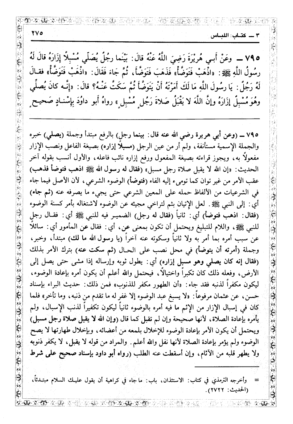 8797 - (وعن أبي هريرة رضي الله عنه قال: بينما رجل) بالرفع مبتدأ وجملة (يصلي) خبره والجملة الإسمية مستأنفة ولم أر من عيَّن الرجل (مسبلاً إزاره) بصيغة الفاعل ونصب الإزار مفعولاً به، ويجوز قراءته بصيغة المفعول ورفع إزاره نائب فاعله والأول أنسب بقوله آخر الحديث «إن الله لا يقبل صلاة رجل مسبل» (قال له رسول الله: اذهب فتوضأ) فذهب عقب الأمر من غير توان كما تومىء إليه الفاء (فتوضأ) الوضوء الشرعي لأن الأصل فيما جاء في الشرعيات من الألفاظ حمل المعنى الشرعي حتى يجىء ما يصرفه عنه (ثم جاء) أي إلى النبي، لعل الإتيان بثم لتراخي مجيئه عن الوضوء لاشتغاله بأمر كسنة الوضوء (فقال: اذهب فتوضأ) أي ثانياً (فقال له رجل) ويحتمل أن تكون بمعنى عن: أي فقال عن المأمور: أي سائلاً عن سبب أمره بما أمر به أولاً الضمير فيه للنبي: أي فقال رجل للنبي واللام للتبليغ، وثانياً وسكوته عنه آخراً (يا رسول الله مالك) مبتدأ وخبر وجملة (أمرته أن يتوضأ) في محل نصب على الحال (ثم سكتّ عنه) بترك الأمر بذلك (قال: إنه كان يصلي وهو مسبل إزاره) أي بطول ثوبه وإرساله إذا مشى حتى يصل إلى الأرض وفعله ذلك كان تكبرا واختيالاً، فيحتمل والله أعلم أن يكون أمره بإعادة الوضوء ليكون مكفراً لذنبه، فقد جاء أن الطهور مكفر للذنوب، فمن ذلك حديث البراء بإسناد حسن عن عثمان مرفوعاً «لا يسبغ عبد الوضوء إلا غفر له ما تقدم من ذنبه وما تأخر» فلما كان في إسبال الإزار من الإثم ما فيه أمره بالوضوء ثانياً ليكون تكفيراً لذنب الإسبال ولم يأمره بإعادة الصلاة لأنها «صحيحه» وإن لم تقبل كما قال (إن الله لا يقبل صلاة رجل مسبل) ويحتمل أن يكون الأمر بإعادة الوضوء للإخلال بلمعة من أعضائه وبإخلال طهارته لا يصح الوضوء ولم يؤمر بإعادة الصلاة لأنها نفل، والله أعلم.