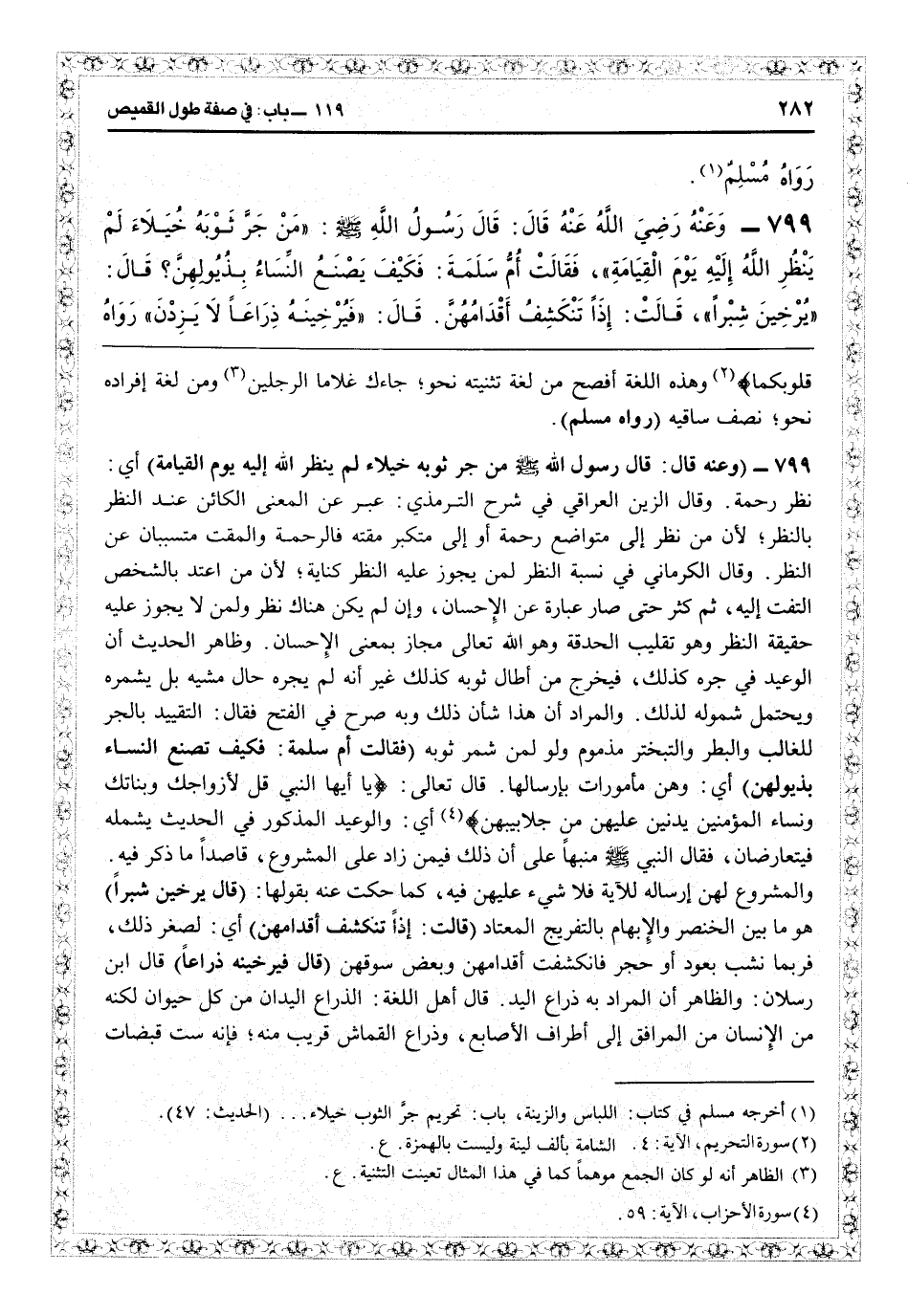 قال تعالى: {يا أيها النبيّ قل لأزواجك وبناتك ونساء المؤمنين يدنين عليهن من جلابيبهن} (الأحزاب: 59) أي والوعيد المذكور في الحديث يشمله فيتعارضان، فقال النبي منبهاً على أن ذلك فيمن زاد على المشروع قاصداً ما ذكر فيه والمشروع لهن إرساله للآية فلا شيء عليهن فيه كما حكت عنه بقولها (قال: يرخين شبراً) هو ما بين الخنصر والإبهام بالتفريج المعتاد (قالت إذن تنكشف أقدامهن) أي لصغر ذلك فربما نشب بعود أو حجر فانكشفت أقدامهن وبعض سوقهن (قال: فيرخينه ذراعاً) قال ابن رسلان: والظاهر أن المراد به ذراع اليد، قال أهل اللغة: الذراع اليدان من كل حيوان، لكنه من الإنسان فيمن المرافق إلى أطراف الأصابع، وذراع القماش قريب منه فإنه ست قبضات