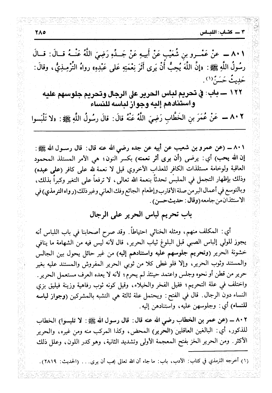 1803 - (عن عمرو بن شعيب عن أبيه عن جده رضي الله عنه قال: قال رسول الله: إن الله يحبّ) أي يرضى (أن يرى أثر نعمته) بكسر النون هي الأمر المستلذ المحمود العاقبة ولوخامة مستلذات الكافر للعذاب الأخروي، قيل لا نعمة لله على كافر (على عبده) وذلك بإظهار التجمل في الملبس تحدثاً بنعمة الله تعالى لا ترفعاً على الغير وكبراً بذلك وبالتوسع في أعمال البرّ من صلة الأقارب وإطعام الجائع وفك العاني وغير ذلك (رواه الترمذي) في الاستئذان من «جامعه» (وقال: حديث حسن) .