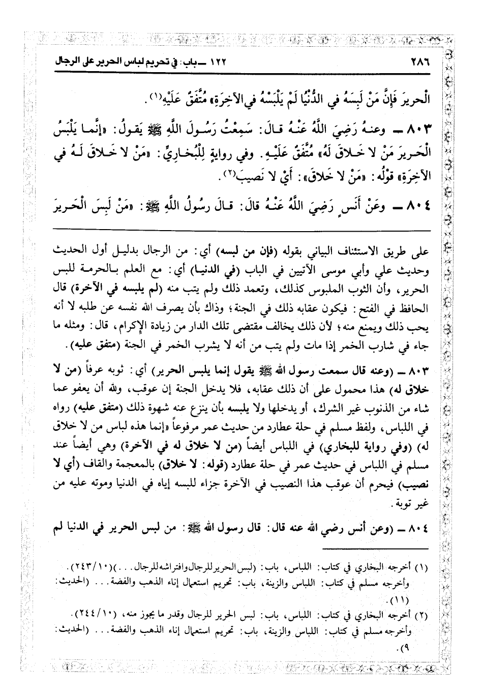 2845 - (وعنه قال: سمعت رسول الله يقول: إنما يلبس الحرير) أي ثوبه عرفاً (من لا خلاق له) ها محمول على أن ذلك عقابه فلا يدخل الجنة إن عوقب، ولله أن يعفو عما شاء من الذنوب غير الشرك أو يدخلها ولا يلبسه بأن ينزع عنه شهوة ذلك (متفق عليه) رواه في اللباس، ولفظ مسلم في حلة عطارد من حديث عمر مرفوعاً «إنما هذه لباس من لا خلاق له» .
