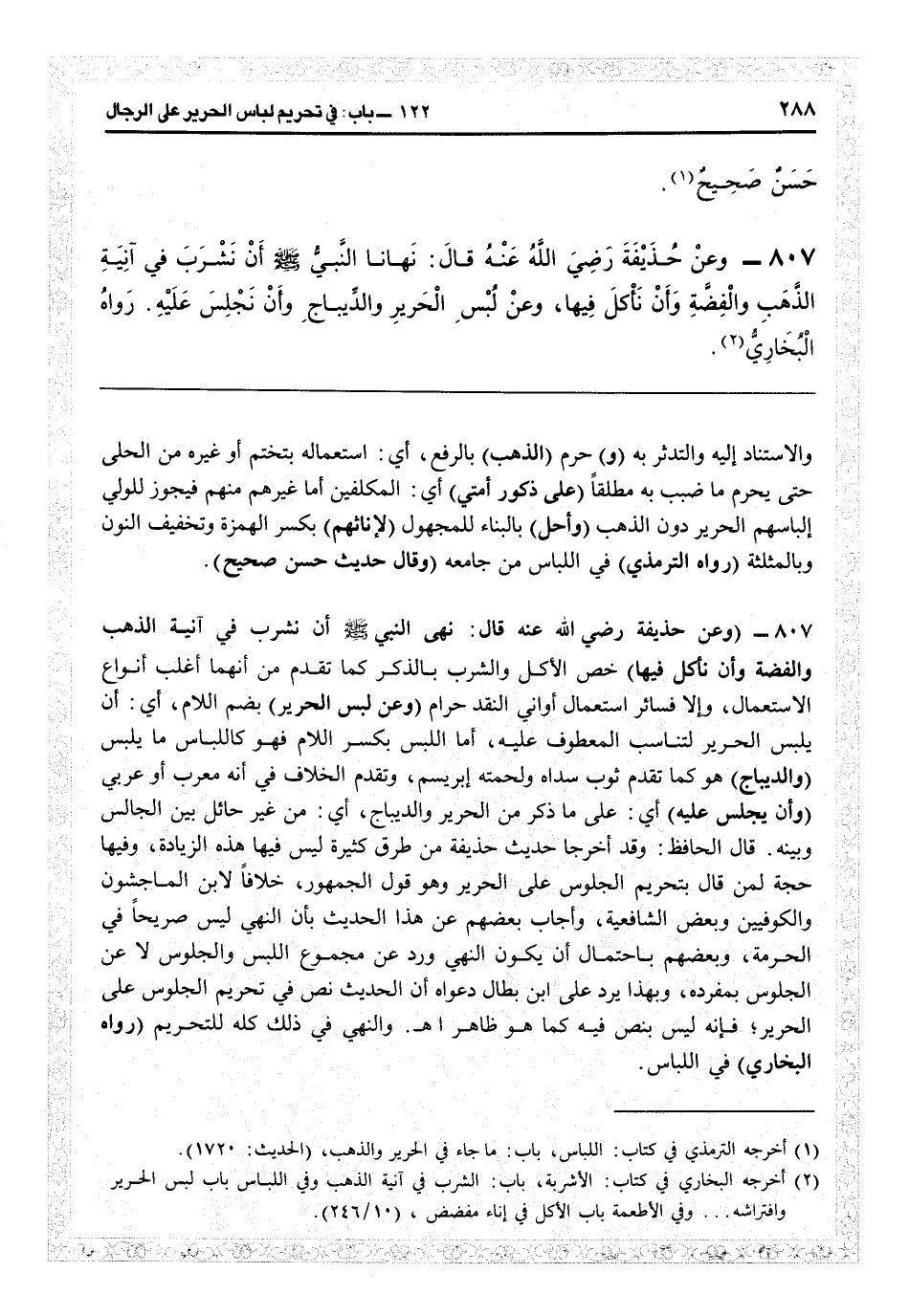 6809 - (وعن حذيفة رضي الله عنه قال: نهى النبيّ أن نشرب) في آنية الذهب والفضة وأن تأكل فيها خص الأكل والشرب بالذكر كما تقدم من أنهما أغلب أنواع الاستعمال وإلا فسائر استعمال أواني النقد حرام (وعن لبس الحرير) بضما للام: أي أن يلبس الحرير لتناسب المعطوف عليه، أما اللبس بكسر اللام فهو كاللباس ما لبس (والديباج) هو كما تقدم ثوب سداه ولحمته إبريسم، وتقدم الخلاف في أنه معرّب أو عربي (وأن تجلس عليه) أي على ما ذكر من الحرير والديباج: أي من غير حائل بين الجالس وبينه، قال الحافظ: قال بتحريم الجلوس على الحرير، وهو قول الجمهور وخلافاً لابن الماجشون والكوفيين وبعض الشافعية. وأجاب بعضهم عن هذا الحديث بأن النهي ليس صريحاً في الحرمة، وبعضهم باحتمال أن يكون النهي ورد عن مجموع اللبس والجلوس لا عن الجلوس بمفرده، وبهذا يرد على ابن بطال دعواه أن الحديث نص في تحريم الجلوس على الحرير فإنه ليس بنص فيه كما هو ظاهر اهـ. والنهي في ذلك كله للتحريم (رواه البخاري) في اللباس: