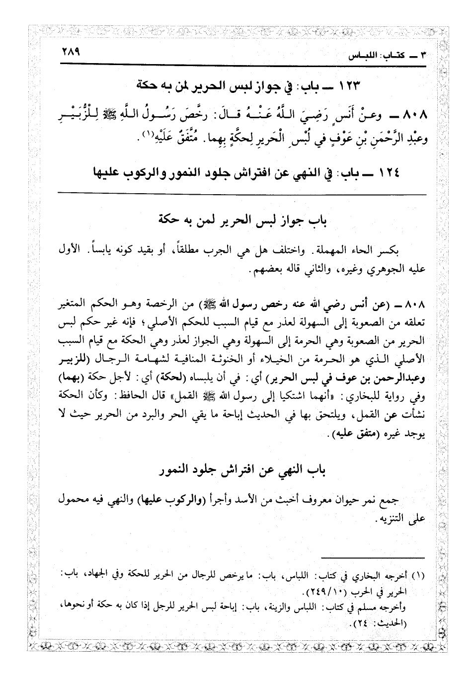 1810 - (عن أنس رضي الله عنه قال: رخص رسول الله) من الرخصة وهو الحكم المتغير تعلقه من الصعوبة إلى السهولة لعذر مع قيام السبب للحكم الأصلي فإنه غير حكم لبس الحرير من الصعوبة، وهي الحرمة إلى السهولة وهي الجواز لعذر وهي الحكة مع قيام السبب الأصلي الذي هو الحزمة من الخيلاء أو الخنوثة المنافية لشهامة الرجال (للزبير وعبد الرحمن بن عوف رضي الله عنهما في لبس الحرير) أي في أن يلبساه (لحكة) أي لأجل حكة (بهما) وفي رواية للبخاري «أنهما اشتكيا إلى رسول الله القمل» قال الحافظ: وكأن الحكة نشأت عن القمل، ويلتحق بها في الحديث إباحة ما يقي الحرّ والبرد من الحرير حيث لا يوجد غيره (متفق عليه) .