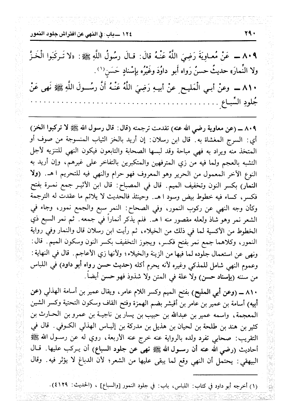 1811 - (عن معاوية رضي الله عنه) تقدمت ترجمته (قال: قال رسول الله: لا تركبوا الخزّ) أي السرج المغشاة به. قال ابن رسلان: إن أريد بالخزّ الثياب المنسوجة من صوف أو المتخذ منه ويراد به فهي مباحة، وقد لبسها الصحابة والتابعون فيكون النهي للتنزيه لأجل التشبه بالعجم، ولما فيه من زي المترفهين والمتكبرين بالتفاخر على غيرهم، وإن أريد به النوع الآخر المعمول من الحرير وهو المعروف فهو حرام، والنهي فيه للتحريم اهـ (ولا النمار) بكسر النون وتخفيف الميم قاله في «المصباح» ، قال ابن الأثير: جمع نمرة بفتح فكسر: كساء فيه خطوط بيض وسود اهـ وحينئذ فالحديث لا يلائم ما عقدت له الترجمة، وكأن وجه النهي عن ركوب النمور وفي «الصحاح» النمر سبع والجمع نمور، وجاء في الشعر نمر وهو شاذ ولعله مقصور منه اهـ. فلم يذكر أنماراً في جمعه ثم نمر السبع ذي الخطوط من الأكسية لما في ذلك من الخيلاء، ثم رأيت ابن رسلان قال: والنمار وفي رواية النمور وكلاهما جمع نمر بفتح فكسر، ويجوز التخفيف بكسر النون وسكون الميم، قال: ونهي عن استعمال جلوده لما فيها من الزينة والخيلاء، ولأنها زي الأعاجم. قال في «النهاية» : وعموم النهي شامل للمذكى وغيره لأنه يحرم أكله (حديث حسن رواه أبو داود) في اللباس من «سننه» (بإسناد حسن) ولا علة في المتن ولا شذوذ فهو حسن أيضاً.