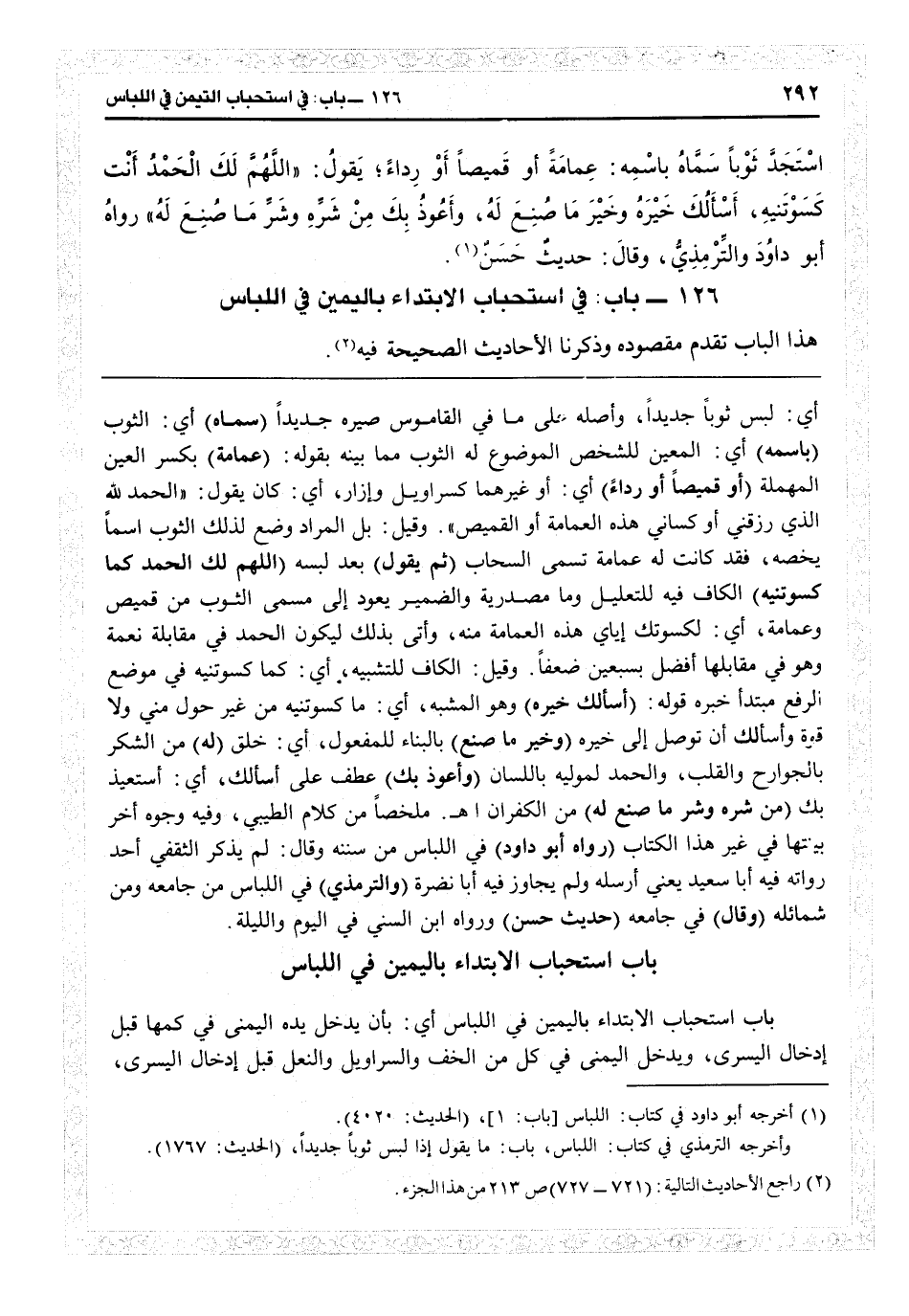 أي لبس ثوباً جديداً وأصله على ما في «القاموس» صبره جديداً (سماه) أي الثوب (باسمه) أي المعين للشخص الموضوع له الثوب مما بينه بقوله (عمامة) بكسر العين المهملة (أو قميصاً أو رداء) أي أو غيرهما كسراويل وإزار: أي كان يقول: الحمد لله الذي رزتني أو كساني هذه العمامة أو القميص، وقيل بل المراد وضع لذلك الثوب اسماً يخصه، فقد كانت له عمامة تسمى السحاب (ثم يقول) بعد لبسه (اللهم لك الحمد كما كسوتنيه) الكاف فيه للتعليل وما مصدرية، والضمير يعود إلى مسمى الثوب من قميص وعمامة: أي لكسوتك إياي هذه العمامة منة، وأتى بذلك ليكون الحمد في مقابلة نعمة وهو في مقابلها أفضل بسبعين ضعفاً، وقيل الكاف للتشبيه: أي كما كسوتنيه في موضع الرفع مبتدأ خبره قوله (أسألك خيره) هو المشبه: أي ما كسوتنيه من غير حول مني ولا قوة، وأسألك أن توصل إلى خيره (وخير ما صنع) بالبناء للمفعول: أي خلق (له) من الشكر بالجوارح والقلب والحمد لموليه باللسان (وأعوذ بك) عطف على أسألك: أي أستعيذ بك (من شره ومن شر ما صنع له) من الكفران اهـ. ملخصاً من كلام الطيبي، وفيه وجوه أخر بينتها في غير هذا الكتاب.