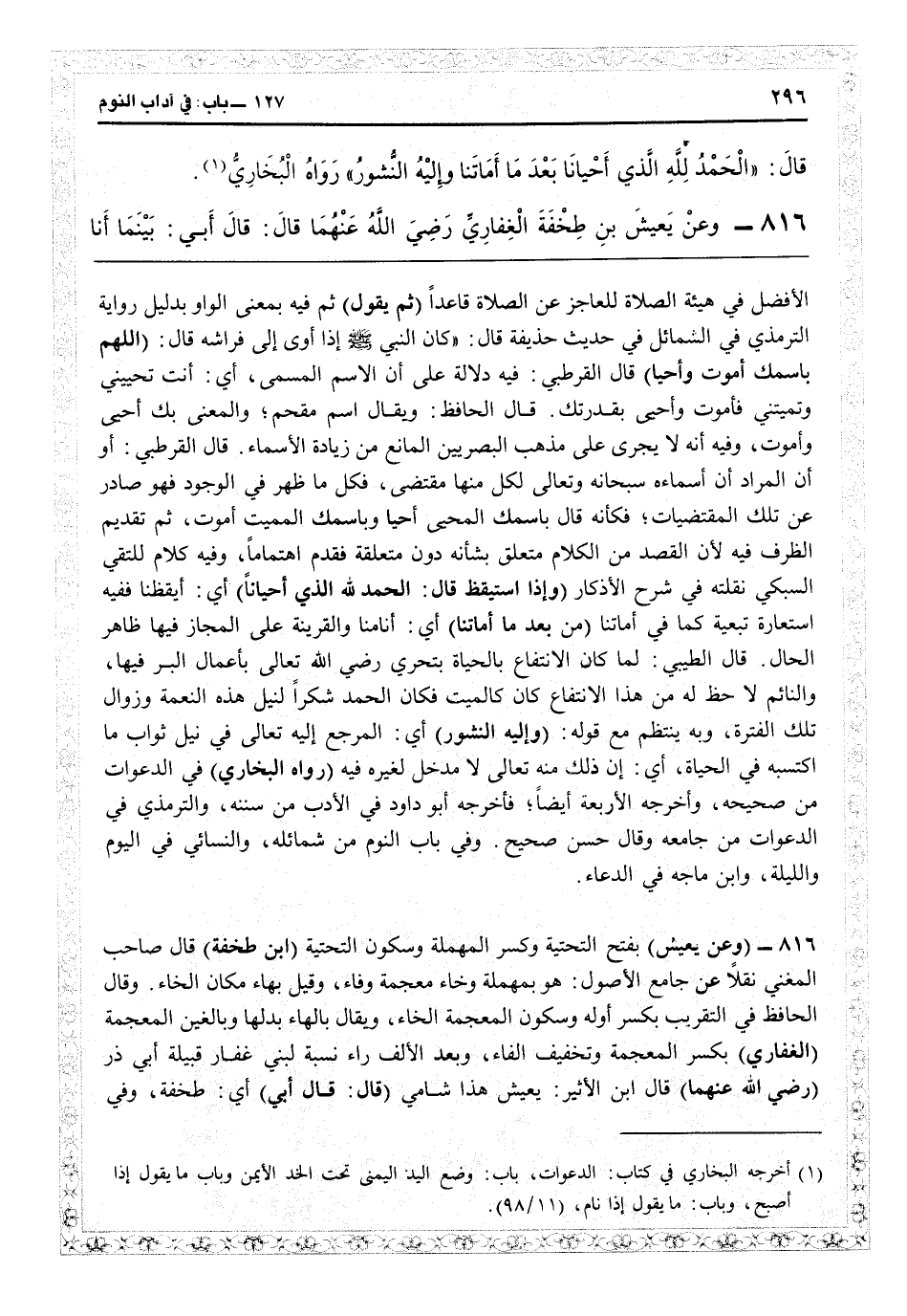الأفضل في هيئة الصلاة للعاجز عن الصلاة قاعداً (ثم يقول) ثم فيه بمعنى الواو بدليل رواية الترمذي في «الشمائل» في حديث حذيفة قال «كان النبيّ إذا أوى إلى فراشه قال (اللهم باسمك أموت وأحيا) قال القرطبي: فيه دلالة على أن الاسم المسمى: أي أنت تحييني وتميتني فأموت وأحيا بقدرتك. قال الحافظ: ويقال اسم مقحم، والمعنى: بك أحيا وأموت. وفيه أنه لا يجري على مذهب البصريين المانع من زيادة الأسماء قال القرطبي: أو أن المراد أن أسمائه سبحانه وتعالى لكل منها مقتضى فكل ما ظهر في الوجود فهو صادر عن تلك المقتضيات، فكأنه قال باسمك المحيى أحيا وباسمك المميت أموت، ثم تقديم الظرف فيه لأن القصد من الكلام متعلق بشأنه دون متعلقه فقدم اهتماماً، وفيه كلام للتقي السبكي نقلته في «شرح الأذكار» (وإذا استيقظ قال: الحمد لله الذي أحيانا) أي أيقظنا ففيه استعارة تبعية كما في آماتنا (من بعد ما أماتنا) أي أنامنا والقرينة علة المجاز فيها ظاهر الحال: قال الطيبي: لما كان الانتفاع بالحياة يتحرّى رضا الله تعالى بأعمال البرّ فيها والنائم لاحظ له من هذا الانتفاع كان كالميت، فكأن الحمد شكراً لنيل هذه النعمة وزوال تلك الفترة وبه ينتظم مع قوله (وإليه النشور) أي المرجع إليه تعالى في نيل ثواب ما اكتسبه في الحياة: أي أن ذلك منه تعالى لا مدخل لغيره فيه (رواه البخاري) في الدعوات من «صحيحه» وأخرجه الأربعة أيضاً، فأخرجه أبو داود في الأدب من «سننه» والترمذي في الدعوات من «جامعه» وقال: حسن صحيح، وفي باب النوم من
