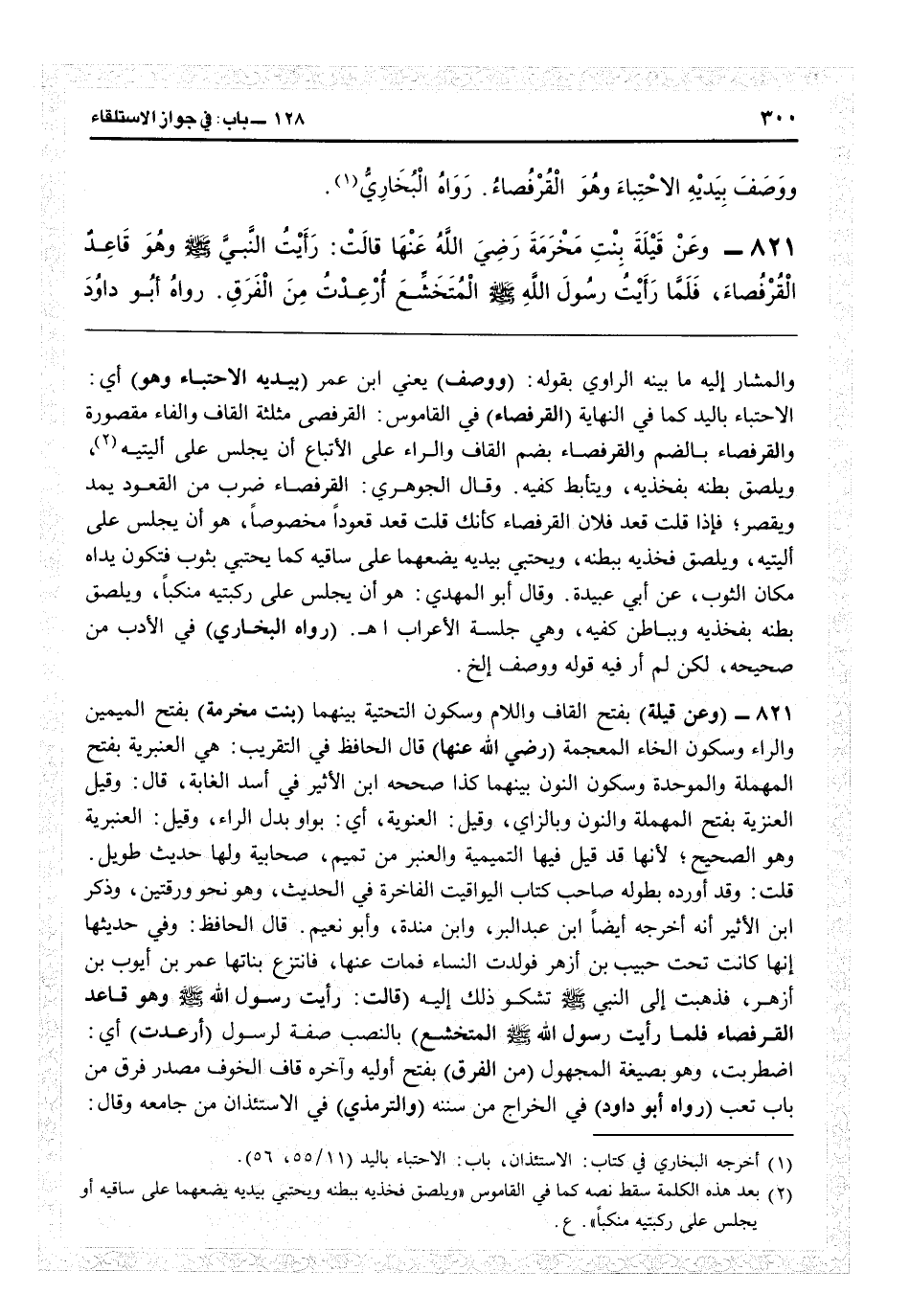 والمشار إليه ما بينه الراوي بقوله (ووصف) في «القاموس» : القرفصى مثلثة القاف والفاء مقصورة والقرفصاء بالضم والقرفصاء بضم القاف والراء على الاتباع أن يجلس على إليتيه ويلصق بطنه بفخذيه ويتأبط كفيه. وقال الجوهري: القرفصاء ضرب من القعود يمد ويقصر فإذا قلت قعد فلان القرفصاء كأنك قلت قعد قعوداً مخصوصاً هو أن يجلس على إليتيه ويلصق فخذيه ببطنه ويحتبي بيديه يضعهما على ساقيه كما يحتبي بثوب فتكون يداه مكان الثوب، عن أبي عبيدة، وقال أبو المهدي: هو أن يجلس على ركبيته منكباً ويلصق بطنه بفخذيه ويتأبط كفيه وهي جلسة الأعراب اهـ (رواه البخاري) أي في الأدب من «صحيحه» لكن لم أر فيه قوله ووصف الخ.