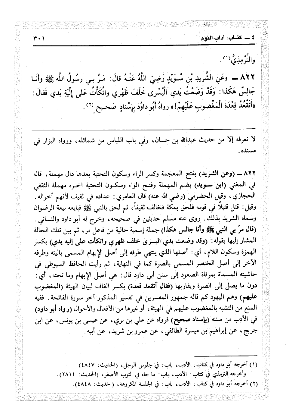 5824 - (وعن الشريد) بفتح المعجمة وكسر الراء وسكون التحتية بعدها دال مهملة قاله في «المغني» (ابن سويد) بضم المهملة وفتح الواو وبسكون التحتية آخره مهملة الثقفي الحجازي وقيل الحضرمي (رضي الله عنه) قال العامري، عداده في ثقيف لأنهم أخواله، وقيل قتل قتيلاً في قومه فلحق بمكة فحالف ثقيفاً، ثم لحق بالنبي فبايعه بيعة الرضوان وسماه الشريد بذلك. روى عنه مسلم حديثين في «صحيحه» ، وخرّج له أبو داود والنسائي (قال: مرّ بي رسول الله وأنا جالس هكذا) جملة اسمية حالية من فاعل مرّ، ثم بين تلك الحالة المشار إليها بقوله (وقد وضعت يدي اليسرى خلف ظهري واتكأت علة إلية يدي) بكسر الهمزة وسكون اللام: أي أصلها الذي ينتهي طرفه إلى أصل الإبهام المسمى بإليته وطرفه الآخر إلى أصل الخنصر المسمى بالصرة كما في «النهاية» ، ثم رأيت الحافظ السيوطي في حاشيته المسماة «بمرفاة الصعود إلى سنن أبي داود» قال: هي أصل الإبهام وما تحته: أي دون ما يصل إلى الصرة ويقاربها (فقال: أتقعد قعدة) بكسر القاف لبيان الهيئة (المغضوب عليهم) وهما اليهود كما قاله جمهور المفسيرين في تفسير المذكور آخر سورة الفاتحة، ففيه المنع من التشبه بالمغضوب عليهم في الهيئة أو غيرها من الأفعال والأحوال (رواه أبو داود) في الأدب من «سننه» (بإسناد صحيح) فرواه عن علي بن برى عن عيسى بن يونس عن ابن جريج عن إبراهيم بن ميسرة الطائفي عن عمرو بن شريد عن أبيه.