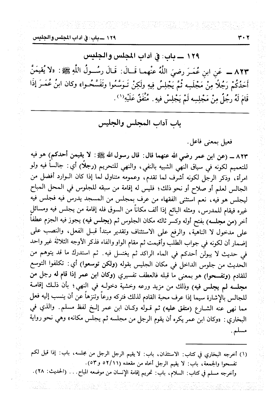 1825 - (وعن ابن عمر رضي الله عنهما قال: قال رسول الله: لا يقيمن أحدكم) هو فيه للتعميم لكونه في سياق النهي الشبيه بالنفي والنهي للتحريم (رجلاً) أي جالساً فيه ولو امرأة، وذكر الرجل لكونه أشرف لما تقدم، وعمومه متناول لما إذا كان الوارد أفضل من الجالس لعلم أو صلاح أو نحو ذلك، فليس له إقامة من سبقه للجلوس في المحل المابح ليجلس هو فيه، نعم استثنى الفقهاء من عرف بمجلس من المسجد يدرس فيه فجلس فيه غيره فيقام للمدرس، ومثله البائع إذا ألف مكاناً من السوق فله إقامة من يجلس فيه ومسائل أخرى (من مجلسه) بفتح أوله وكسر ثالثه مكان الجلوس (ثم يجلس فيه) يجوز فيه الجزم عطفاً على مدخول لا الناهية والرفع على الاستئناف وتقدير مبتدأ قبل الفعل والنصب علة إضمار أن لكونه في جواب الطلب وأقيمت «ثم» مقام «الواو والفاء» فذكر الأوجه الثلاثة غير واحد في حديث «لا يبولنّ أحدكم في الماء الراكد ثم يغتسل فيه» . ثم استدرك ما قد يتوهم من الحديث من جلوس الداخل في مكان الجليس بقوله (ولكن توسعوا) أي تكلفوا التوسع للقادم (وتفسحوا) هو بمعنى ما قبله فالعطف تفسيري (وكان ابن عمر إذا قام له رجل من مجلسه لم يجلس فيه) وذلك من مزيد ورعه وخشية دخوله في النهي بأن ذلك إقامة للجالس بالإشارة سيما إذا عرف محبة القادم لذلك فتركه ورعاً وتنزّهاً على أن ينسب إليه فعل مما نهى عنه الشارع (متفق عليه) ثم قوله «وكان ابن عمر الخ» لفظ مسلم، والذي في البخاري «وكان ابن عمر يكره أن يقوم الرجل من مجلسه ثم يجلس مكانه» وهي نحو رواية مسلم.