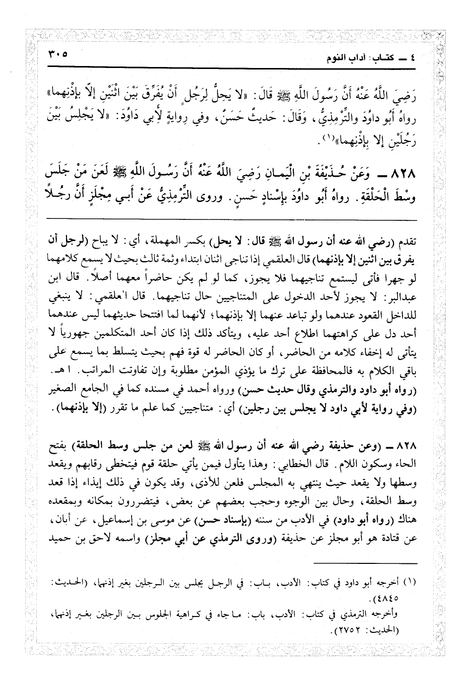 تقدم رضي الله عنه أن رسول الله قال: (لا يحلّ) بكسر المهملة: أي لا يباح (لرجل أن يفرق بين اثنين إلا بإذنهما) قال العلقمي: إذا تناجى اثنان ابتداء وثمة ثالث بحيث لا يسمع كلامهما لو جهرا فأتى ليستمع تناجيهما فلا يجوز، كما لو لم يكن حاضراً معهما أصلاً، قال ابن عبد البر: لا يجوز لأحد الدخول على المتناجين حال تناجيهما. قال العلقمي: لا ينبغي للداخل القعود عندهما ولو تباعد عنهما إلا بإذنهما لأنهما لما افتتحا حديثهما ليس عندهما أحد دلّ على كراهتهما اطلاع أحد عليه، ويتأكد ذلك إذا كان أحد المتكلمين جهورياً لا يتأتى له إخفاء كلامه من الحاضر أو كان الحاضر له قوة فهم بحيث يتسلط بما يسمع على باقي الكلام به، فالمحافظة علة ترك ما يؤذي المؤمن مطلوبة وإن تفاوتت المراتب اهـ (رواه أبو داود والترمذي وقال: حديث حسن) ورواه أحمد في «مسنده» كما في الجامع الصغير (وفي رواية رواية لأبي داود: لا يجلس بين رجلين) أي متناجيين كما علم ما تقرر (إلا بإذنهما) .