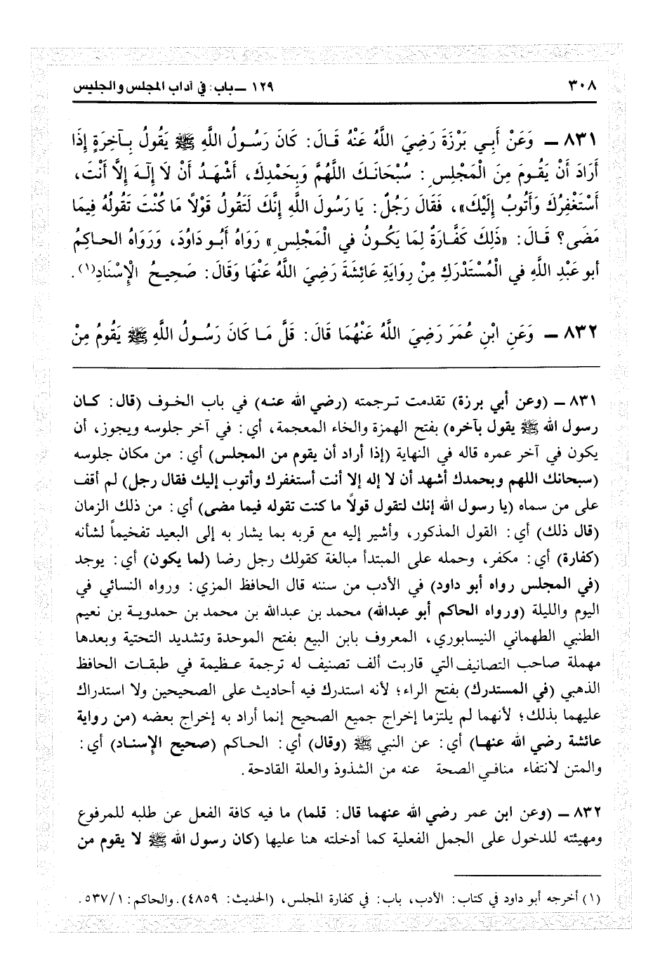 9833 - (وعن أبي برزة) تقدمت ترجمته (رضي الله عنه) في باب الخوف (قال: كان رسول الله يقول بأخرة) بفتح الهمزة والخاء المعجمة: أي في آخر جلوسه، ويجوز أن يكون في آخر عمره، قاله في النهاية (إذا أراد أن يقوم من المجلس) أي من مكان جلوسه (سبحانك اللهم وبحمدك، أشهد أن لا إله إلا أنت أستغفرك وأتوب إليك فقال رجل) لم أقف على ما سماه (يا رسول الله إنك لتقول قولاً ما كنت تقوله فيما مضى) أي من ذلك الزمان (قال: ذلك) أي القول المذكور وأشير إليه مع قربه بما يشار به إلى البعيد تفخيماً لشأنه (كفارة) أي مكفر، وحمله على المبتدأ مبالغة كقولك رجل رضا (لما يكون) أي يوجد (في المجلس. رواه أبو داود) في الأدب من «سننه» ، قال الحافظ المزي: ورواه النسائي في اليوم والليلة (ورواه الحاكم أبو عبد الله) محمد بن عبد الله بن حمدويه بن نعيم الطنبي الطهماني النيسابوري المعروف بابن البيع بفتح الموحدة وتشديد التحتية وبعدها مهملة، صاحب التصانيف التي قاربت ألف تصنيف، له ترجمة عظيمة في «طبقات الحافظ الذهبي» (في المستدرك) بفتح الراء لأنه استدرك فيه أحاديث على «الصحيحين» ولا استدراك عليهما بذلك لأنهما لم يلتزم إخراج جميع الصحيح إنما أراد به إخراج بعضه (من رواية عائشة رضي الله عنها) أي عن النبي (وقال) أي الحاكم (صحيح الإسناد) أي والمتن لانتفاء منافي الصحة عنه من الشذوذ والعلة القادحة.