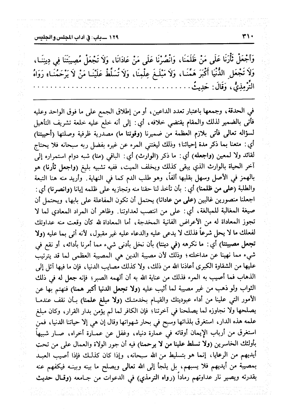 في الحدقة وجمعها باعتبار تعدد الداعين أو من إطلاق الجمع على ما فوق الواحد وعليه فأتى بالضمير لذلك والمقام يقتضي خلافه: أي إلى أن خلع عليه خلعة تشريف التأهيل لسؤاله تعالى فأتى بلازم العظمة من ضمير «نا» (وقوتنا ما) مصدرية ظرفية وصلتها (أحييتنا) أي متعنا بما ذكر مدة إحيائنا وذلك ليغتني المرء عن غيره بفضل ربه سبحانه فلا يحتاج لقائد ولا لمعين (واجعله) أي ما ذكر (الوارث) أي الباقي (منا) شبه دوام استمراره إلى آخر الحياة بالوارث الذي يبقى كذلك ويخلف الميت ففيه تشبيه بليغ (واجعل ثأرنا) هو بالهمزة في الأصل وسهل بقلبها ألفاً وهو طلب الدم كما في «النهاية» وأريد منه هنا التبعة والطلبة (على من ظلمنا) أي بأن تأخذ لنا حقنا منه وتجازيه على ظلمه إباناً (وانصرنا) أي اجعلنا منصورين غالبين (على من عادانا) يحتمل أن تكون المفاعلة على بابها ويحتمل أن صيغة المغالبة للمبالغة: أي على من انتصب لعداوتنا، وظاهر أن المراد المعادي لما لا تجوز المعاداة له من الأعراض الفانية المخدجة، أما المعاداة لله كأن وقعت منه عداوتك لفعلك ما لا يحل شرعاً فذلك لا يدعي عليه، والدعاء عليه غير مقبول لأنه أتى بما عليه (ولا تجعل مصيبتنا) أي ما نكرهه (في ديننا) بأن نخل بأدنى شيء مما أمرنا بأدائه أو نقع في شيء ما نهينا عن مداخلته وذلك لأن مصيبة الدين هي المصيبة العظمى لما قد يترتب عليها من الشقاوة الكبرى أعاذنا الله من ذلك، ولا كذلك مصائب الدنيا فإن ما فيها آيل إلى الذهاب، فما أصيب به المرء فذلك من عناية الله به، إن ألهمه الصبر فإنه جعل له في ذلك الثواب، ولو ذهب من غير مصيبة لما أثيب عليه (ولا تجعل الدنيا أكبر همنا) فتهتم بها عن الأمور التي علينا من أداء عبوديتك والقيام بخدمتك (ولا مبلغ علمنا) بأن نقف عند ما يصلحها ولا نجاوزه لما يصلحنا في آخرتنا فإن الكافر لما لم يؤمن بدار القرار وكان