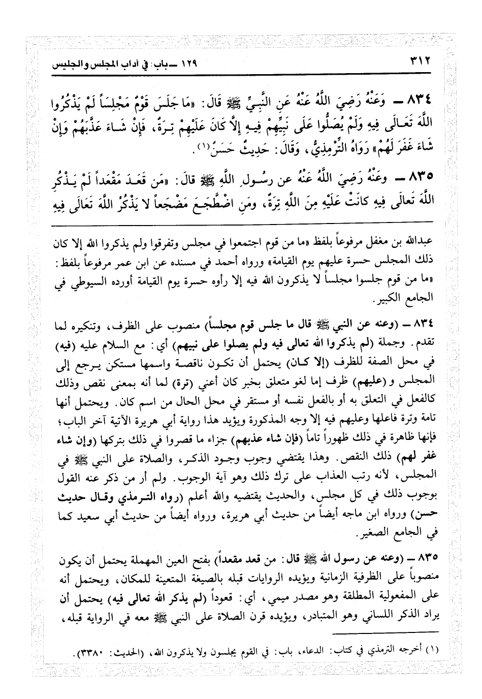 12836 - (وعنه عن النبي قال: ما جلس قوم مجلساً) منصوب على الظرف وتنكيره لما تقدم، وجملة (لم يذكروا الله تعالى فيه ولم يصلوا على نبيهم) أي مع السلام عليه (فيه) محل الصفة للظرف (إلا كان) يحتمل أن تكون ناقصة واسمها مستكن يرجع إلى المجلس و (عليهم) ظرف إما لغو متعلق بخبر كان أعنى (ترة) لما أنه بمعنى نقص وذلك كالفعل في التعلق به أو بالفعل نفسه أو مستقر في محل الحال من اسم كان، ويحتمل أنها تامة وترة فاعلها وعليهم فيه الأوجه المذكورة، ويؤيدها رواية أبي هريرة الآتية آخر الباب فإنها ظاهرة في ذلك ظهوراً تاماً (فإن شاء عذبهم) جزاء قصروا في ذلك بتركها (وإن شاء غفر لهم) ذلك النقص وهذا يقتضي وجوب وجود الذكر والصلاة على النبي في المجلس لأنه رتب العذاب على ترك ذلك وهو آية الوجوب، ولم أر من ذكر عنه القول بوجوب ذلك في كل مجلس والحديث يقتضيه والله أعلم (رواه الترمذي وقال حديث حسن) ورواه ابن ماجه أيضاً من حديث أبي هريرة، ورواه أيضاً من حديث أبي سعيد كما في «الجامع الصغير» .