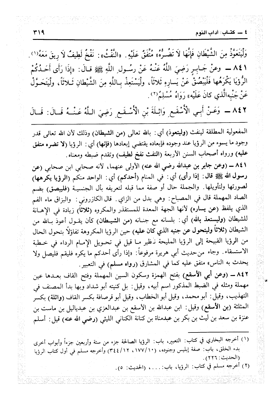 6843 - (وعن جابر) بن عبد الله (رضي الله عنه) الأولى عنهما لأنه صحابي ابن صحابي (عن رسول الله قال إذا رأى) أي في المنام (أحدكم) أي الواحد منكم (الرؤيا يكرهها) لصورتها أو لتأويلها، والجملة حال أو صفة مما قبله لتعريفه بأن الجنسية (فليبصق) بضم الصاد المهملة، قال في «المصباح» : وهي بدل من الزاي. قال الكازروني: والبزاق ماء الفم الذي يلفظ (عن يساره) لأنها الجهة المعدة للمستقذر والمكروه (ثلاثاً) زيادة في الإهانة للشيطان (وليستعذ بالله) أي بلسانه مع جنانه (من الشيطان) كأن يقول أعوذ بالله من الشيطان (ثلاثاً وليتحول عن جنبه الذي كان عليه) حين الرؤيا المكروهة تفاؤلاً بتحول الحال من الرؤيا القبيحة إلى الرؤيا المليحة نظير ما قيل في تحويل الإمام الرداء في خطبة الاستسقاء وجاء من حديث أبي هريرة مرفوعاً «إذا رأى أحدكم ما يكره فليقم فليصل ولا يحدث به الناس» متفق عليه كما في «المشارق» (رواه مسلم) في التعبير.