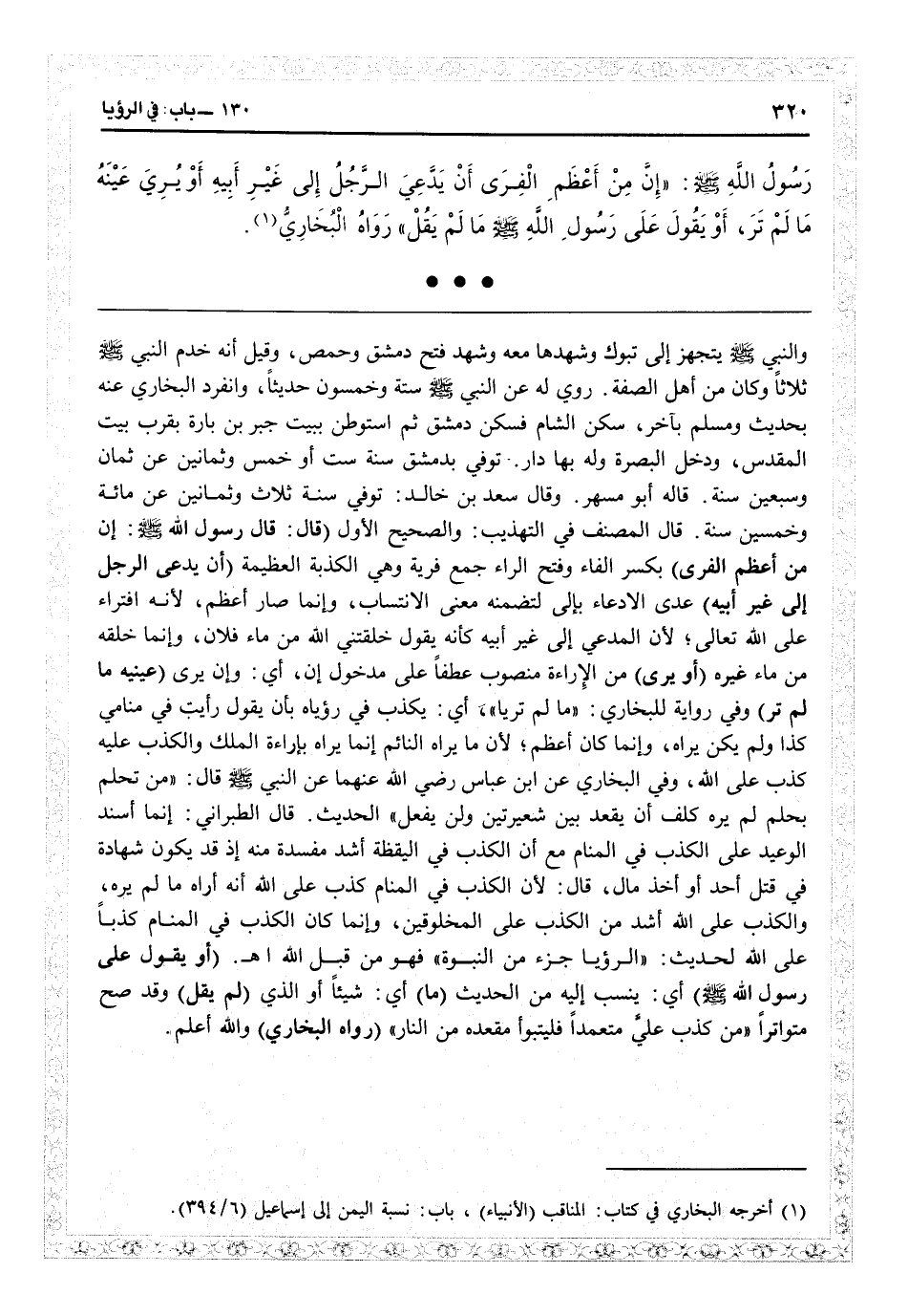 والنبي يتجهز إلى تبوك وشهدها معه وشهد فتح دمشق وحمص، وقيل إنه خدم النبي ثلاثاً، وكان من أهل الصفة، روى له عن النبي ستة وخمسون حديثاً، وانفرد البخاري عنه بحديث ومسلم بآخر، سكن الشام فسكن دمشق ثم استوطن ببيت (جبرين بارة) بقرب بيت المقدس، ودخل البصرة وله بها دار، توفي بدمشق سنة ست أو خمس وثمانين عن ثمان وسبعين سنة، قاله أبو مسهر. وقال سعد بن خالد: توفي سنة ثلاث وثمانين عن مائة وخمسين سنة، قال المصنف في «التهذيب» : والصحيح الأول (قال: قال رسول الله: إن من أعظم الفرى) بكسر الفاء وفتح الراء جمع فرية: وهي الكذبة العظيمة (أن يدعي الرجل إلى غير أبيه) عدى الادعاء بإلى لتضمنه معنى الانتساب، وإنما صار أعظم لأنه افتراء على الله تعالى لأن المدعي إلى غير أبيه كأنه يقول: خلقني الله من ماء فلان وإنما خلقه من ماء غيره (أو يرى) من الإراءة منصوب عطفاً على مدخلو أن: أي وأن يرى (عينيه ما لم تر) وفي رواية البخاري «ما لم تريا» أي يكذب في رؤياه بأن يقول: رأيت في منامي كذا ولم يكن يراه، وإنما كان أعظم لأن ما يراه النائم إنما يراه بإراءة الملك، والكذب عليه كذب على الله. وفي البخاري عن ابن عباس رضي الله عنهما عن النبي قال «من تحلم بحلم لم يره كلف أن يعقد بين شعيرتين ولن يفعل» الحديث. قال الطبراني: إنما أسند الوعيد على الكذب في المنام مع أن الكذب في اليقظة أشد مفسدة منه، إذ قد يكون شهادة في