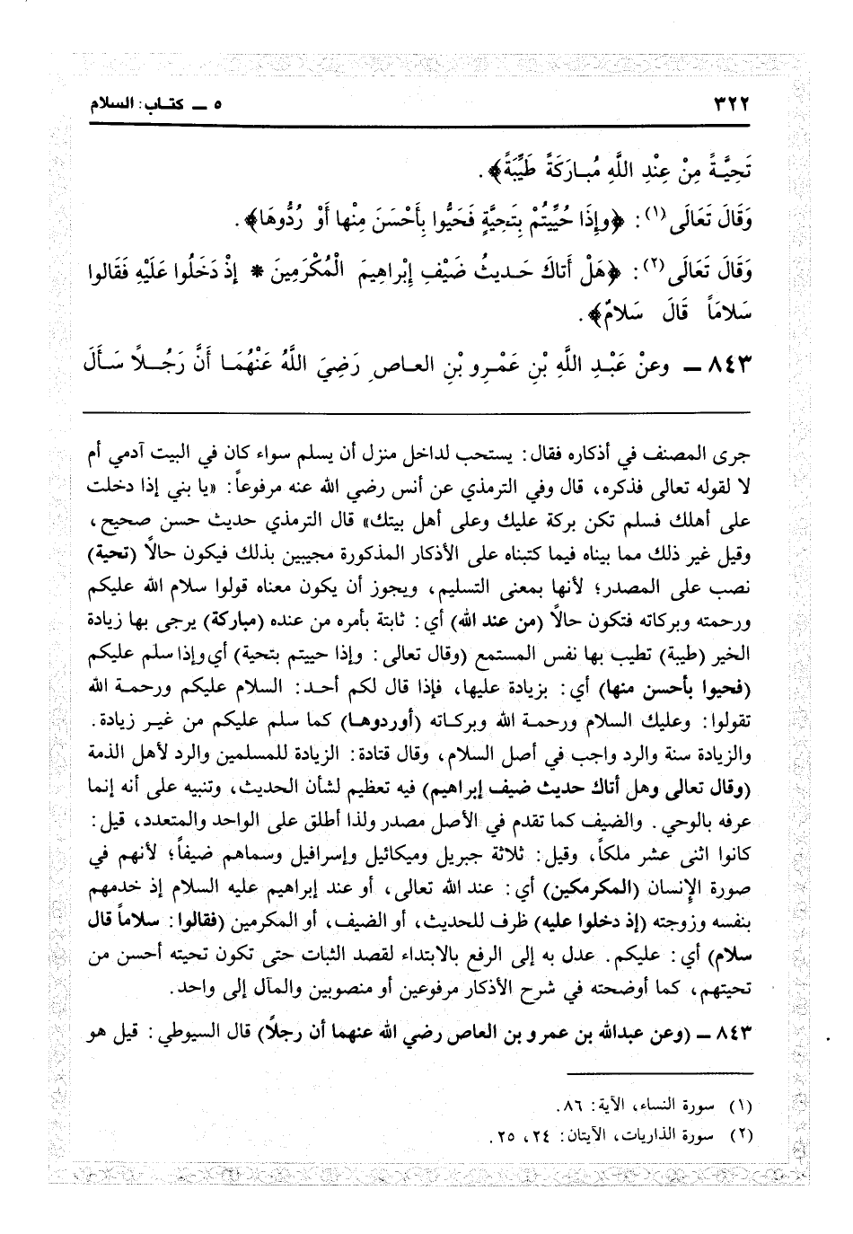 (وقال تعالى) : ( {وإذا حييتم بتحية} ) أي وإذا سلم عليكم ( {فحيوا بأحسن منها} ) أي بزيادة عليها، فإذا قال لكم أحد: السلام عليكم ورحمة الله، فقولوا: وعليك السلام ورحمة الله وبركاته ( {أو ردوها} ) كما سلم عليكم من غير زيادة، والزيادة سنة، والرد واجب في أصل السلام. وقال قتادة: الزيادة للمسلمين، والرد لأهل السنة.