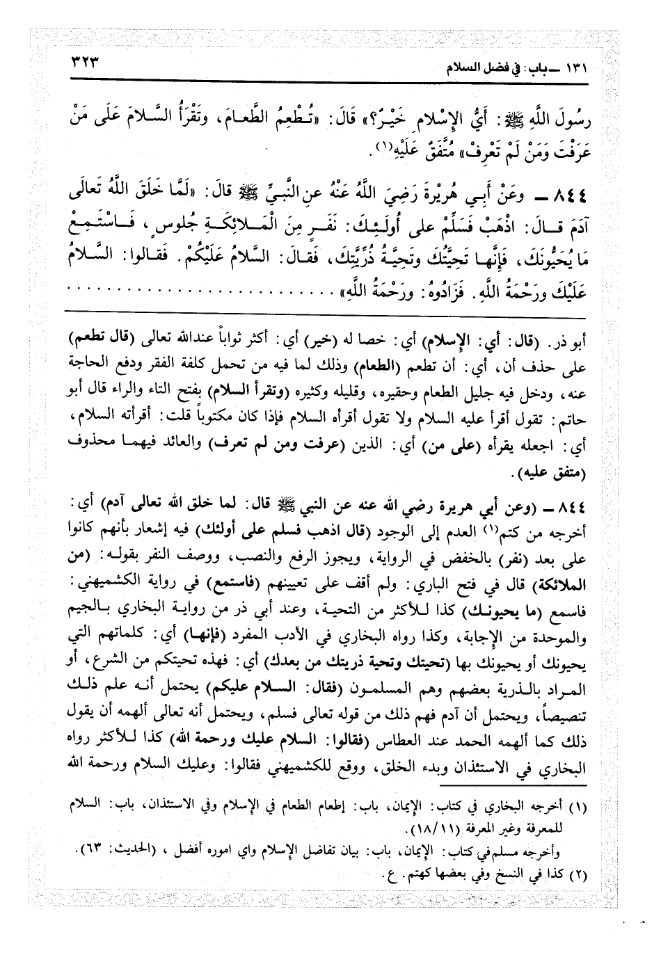 2846 - (وعن أبي هريرة رضي الله عنه عن النبي قال: لما خلق الله تعالى آدم) أي أخرجه من كتم العدم إلى الوجود (قال: اذهب فسلم على أولئك) فيه إشعار بأنهم كانوا على بعد (نفر) بالخفض في الرواية، ويجوز الرفع والنصب ووصف النفر يقوله (من الملائكة) قال في فتح «الباري» : ولم أقف على تعيينهم (فاستمع) في رواية الكشميهني «فاسمع» (ما يحيونك) كذا لللأكثر من التحية، وعند أبي ذرّ من رواية البخاري بالجيم والموحدة من الإجابة وكذا رواه البخاري في «الأدب المفرد» (فإنها) أي كلماتهم التي يحيونك أو يجيبونك بها (تحيتك وتحية ذريتك من بعدك) أي فهذه تحيتكم من الشرع أو المراد بالذرية بعضهم وهم المسلمون (فقال: السلام عليكم) يحتمل أنه علم ذلك تنصيصاً ويحتمل أن آدم فهم ذلك من قوله تعالى «فسلم» ويحتمل أنه تعالى ألهمه أن يقول ذلك كما ألهمه الحمد عند العطاس (فقالو السلام عليك ورحمة الله) كذا للأكثر رواه البخاري في الاستئذان وبدء الخلق، ووقع للكشميهني فقالوا: وعليك السلام ورحمة الله