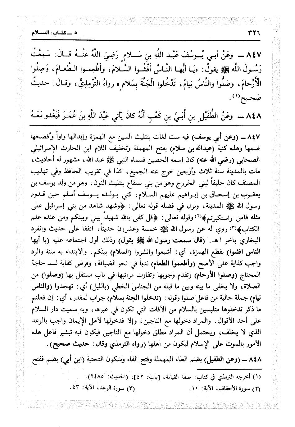 5849 - (وعن أبي يوسف) فيه ستّ لغات بتثليث السين مع الهمزة، وإبدالها واواً وأفصحها ضماً، وهذه كنية (عبد الله بن سلام) بفتح المهملة وتخفيف اللام ابن الحارث الإسرائيلي الصحابي (رضي الله عنه) كان اسمه الحصين فسماه النبي عبد الله مشهور له أحاديث، مات بالمدينة سنة ثلاث وأربعين، خرّج عنه الجميع كذا في «تقريب الحافظ» وفي «تهذيب» المصنف، كان حليفاً لبني الخزرج، وهو من بني نسقاع بتثليث النون، وهو من ولد يوسف بن يعقوب بن إسحاق بن إبراهيم عليهم الصلاة والسلام: كني بولده يوسف، أسلم حين قدوم رسول الله المدينة ونزل في فضله قوله تعالى: {وشهد شاهد من بني إسرائيل على مثله فآمن واستكبر تم} (الأحقاف: 10) وقوله تعالى: {قل كفى بالله شهيداً بيني وبينكم ومن عنده علم الكتاب} (الرعد: 34) روي له عن رسول الله خمسة وعشرون حديثاً، اتفقا على حديث، وانفرد البخاري بآخر اهـ (قال: سمعت رسول الله يقول) وذلك أول اجتماعه عليه (يا أيها الناس أفشوا) يقطع الهمزة: أي أشيعوا وانشروا (السلام) بينكم، والابتداء به سنة والرد واجب كفاية على الأصح (وأطمعوا الطعام) ندباً في نحو الضيافة، وفرض كفاية لسد حاجة المحتاج (وصلوا الأرحام) وتقدم وجوبها وتفاوت مراتبها في باب مستقل بها (وصلوا) من الصلاة ولا يخفى ما بينه وبين ما قبله من الجناس الخطي (بالليل) أي تهجدوا (والناس نيام) جملة حالية من فاعل صلوا، وقوله (تدخلوا الجنة بسلام) جواب لمقدر: أي إن فعلتم ما ذكر تدخلوها متلبسين بالسلام من الآفات التي تكون في غيرها وبه سميت دار السلام على أحد الأقوال، والمراد دخولها مع الناجين، وإلا فدخولها لأهل الإيمان واجب بالوعد الذي لا يخلف. ويحتمل أن المراد مطلق دخولها مع الناجين فيكون فيه تبشير فاعل هذه الأمور بالموت على الإسلام ليكون من أهلها (رواه الترمذي وقال حديث صحيح) .