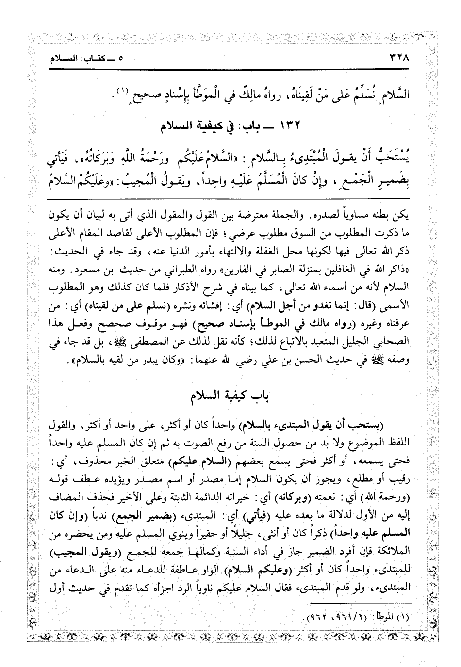(يستحب أن يقول المبتدىء بالسلام) واحداً كان أو أكثر على واحد أو أكثر، والقول اللفظ الموضوع، ولا بد في حصول السنة من رفع الصوت به، ثم إن كان المسلم عليه واحداً فحتى يسمعه أو أكثر فحتى يسمع بعضهم (السلام عليكم) متعلق الخبر محذوف: أي رقيب أو مطلع، ويجوز أن يكون السلام إما مصدراً أواسم مصدر، ويؤيده عطف قوله (ورحمة الله) أي نعمته (وبركاته) أي خيراته الدائمة الثابتة، وعلى الأخير فحذف المضاف إليه من الأول لدلالة ما بعده عليه (فيأتي) أي المبتدىء (بضمير الجمع) ندباً (وإن كان المسلم عليه واحداً ذاكراً كان أو أنثى جليلاً أو حقيراً وينوي المسلم عليه ومن يحضره من الملائكة، فإن أفرد الضمير جاز في أداء السنة، وكمالها جمعه للجمع (ويقول المجيب) للمبتدىء واحداً كان أو أكثر (وعليكم السلام) الواو عاطفة للدعاء منه على الدعاء من المبتدىء، ولو قدم المبتدىء فقال السلام عليكم ناوياً الرد أجزأه كما تقدم في حديث أول